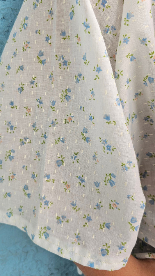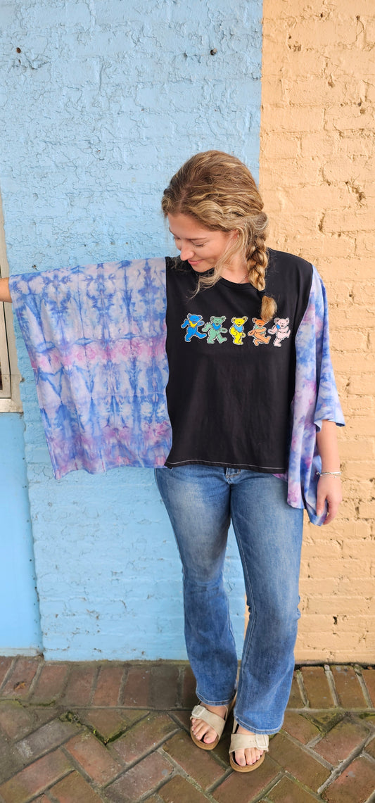 Sleeves are tacked under the arm hole to the bottom of the outside of the sleeve, making this top feel like a poncho, but with the closure of a shirt