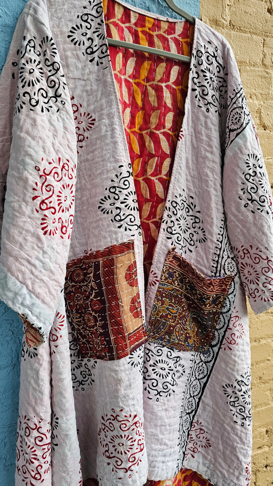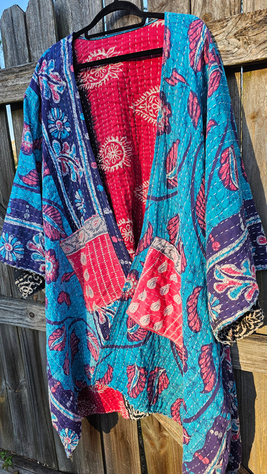 Our kantha kimonos are truly unique as we already get them in as a one of a kind blanket. We then turn them into a bohemian and comfortable kimono just for you! Message us for custom requests