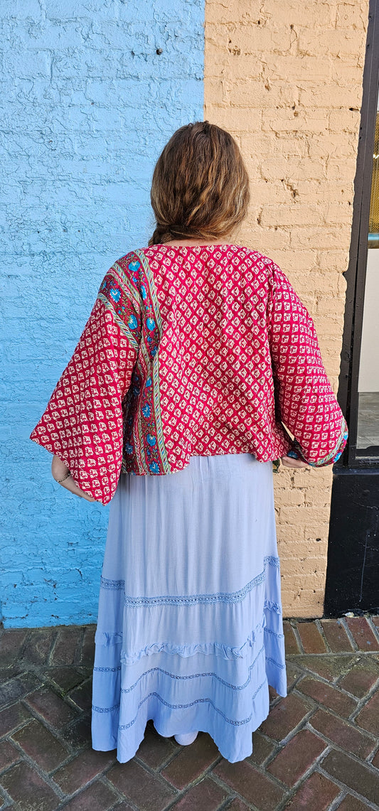 Introducing our new Kantha Cardigan. It is a funky and versatile option for free-spirited fashionistas. This Little Hippie Chick original design is reversible so it can be worn two ways for twice the fun. Hits right at the waist. The front is cut at an angle for extra coverage. Features our traditional bell sleeve.