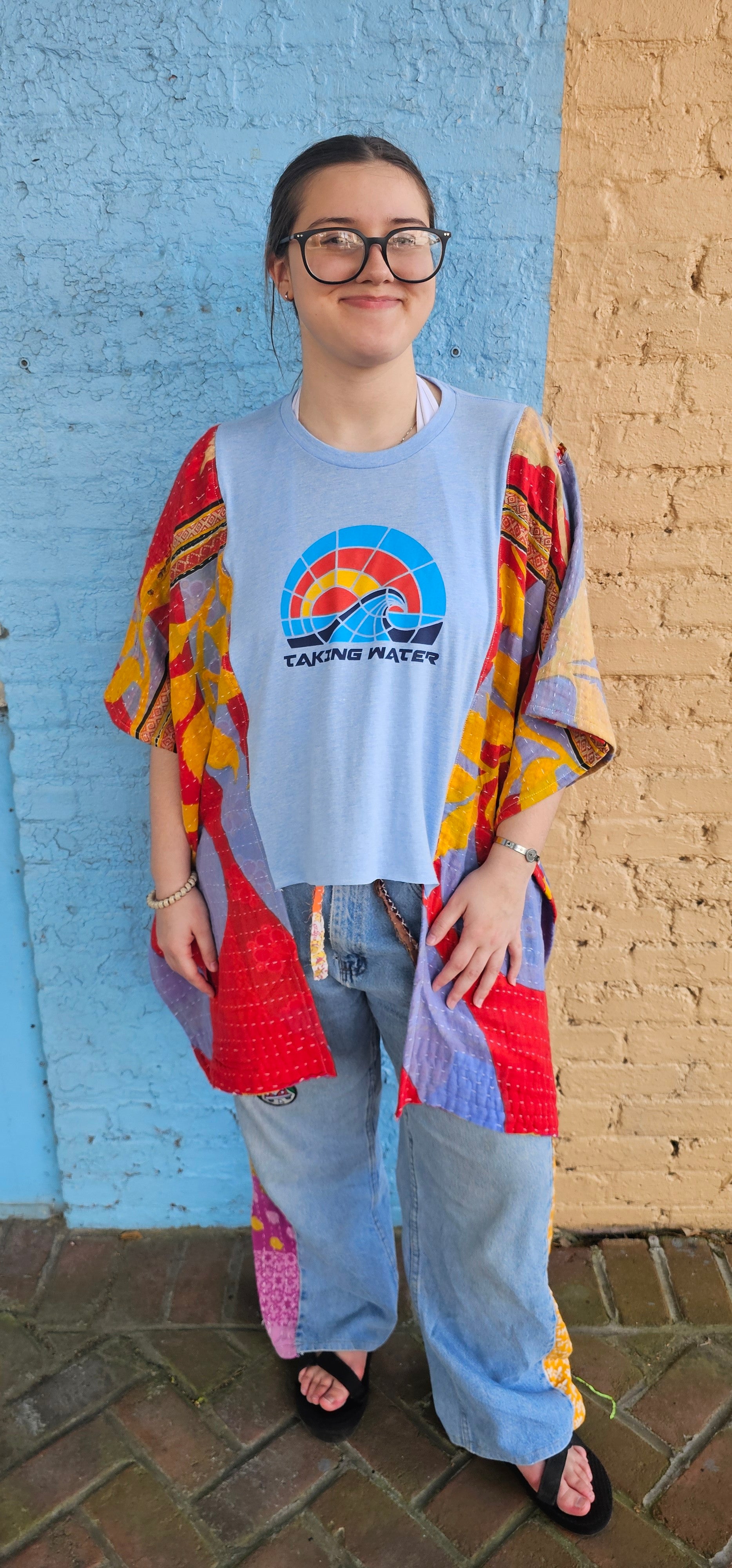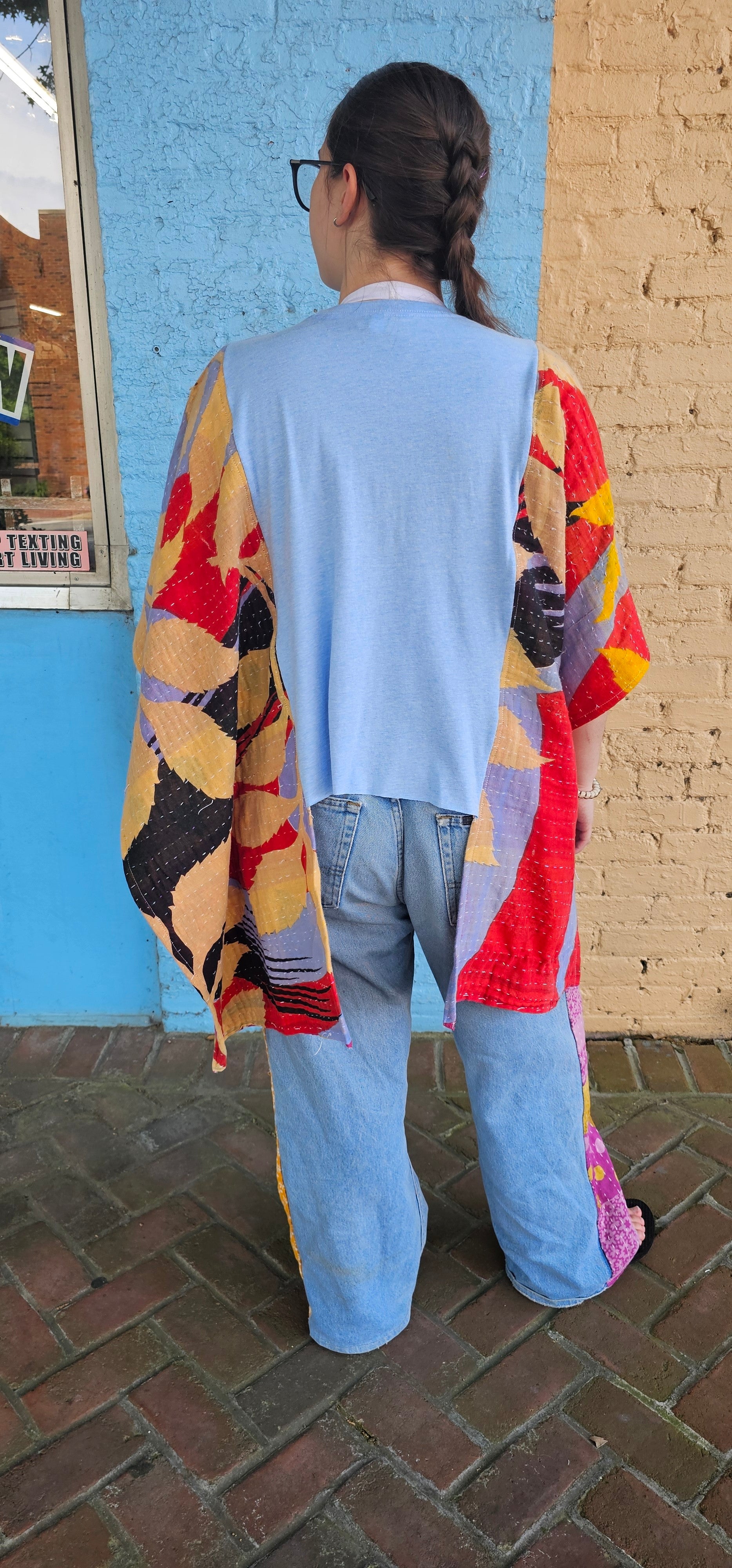 Shirt hits around waist length. Kantha sleeves hang further making this piece have lots of groovy flow.
