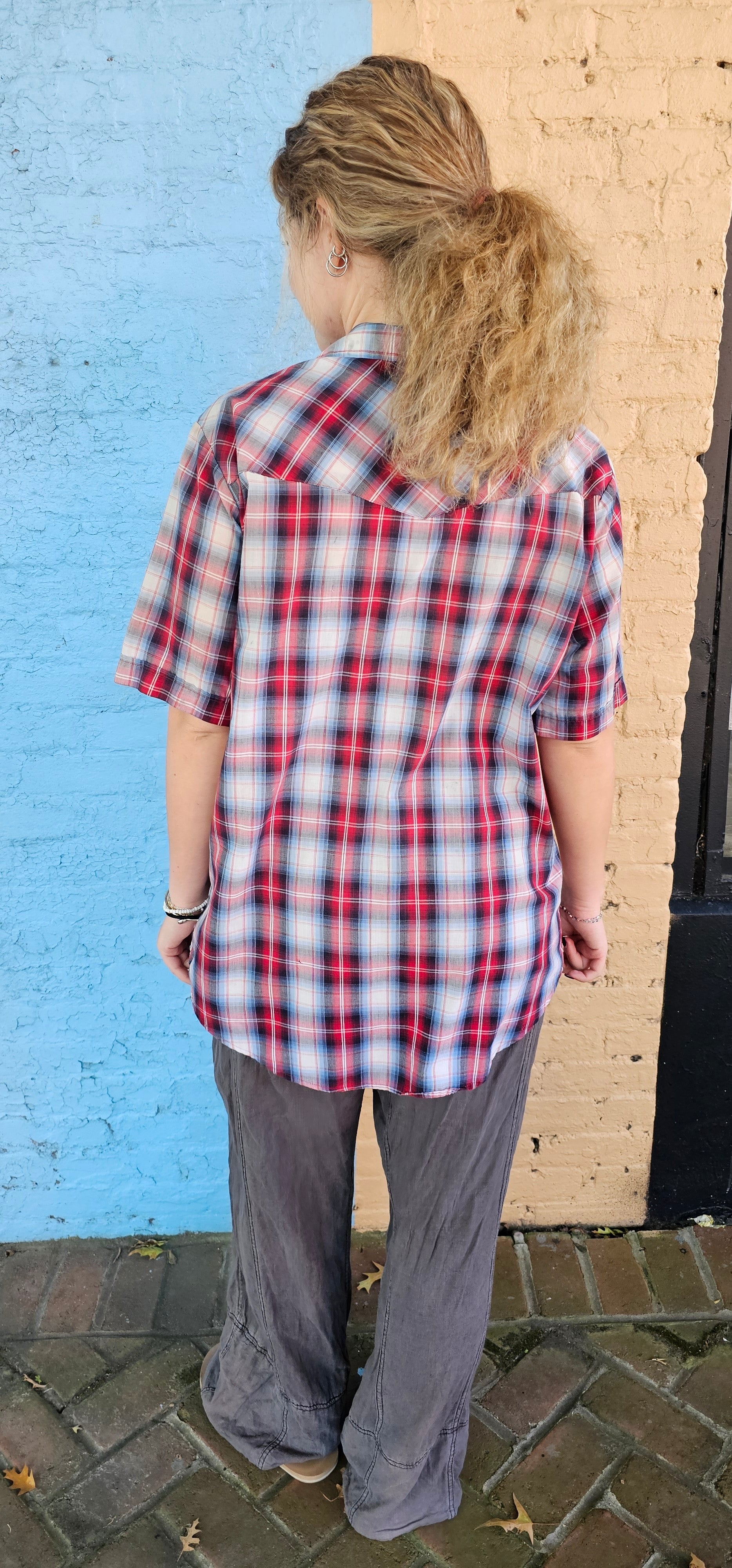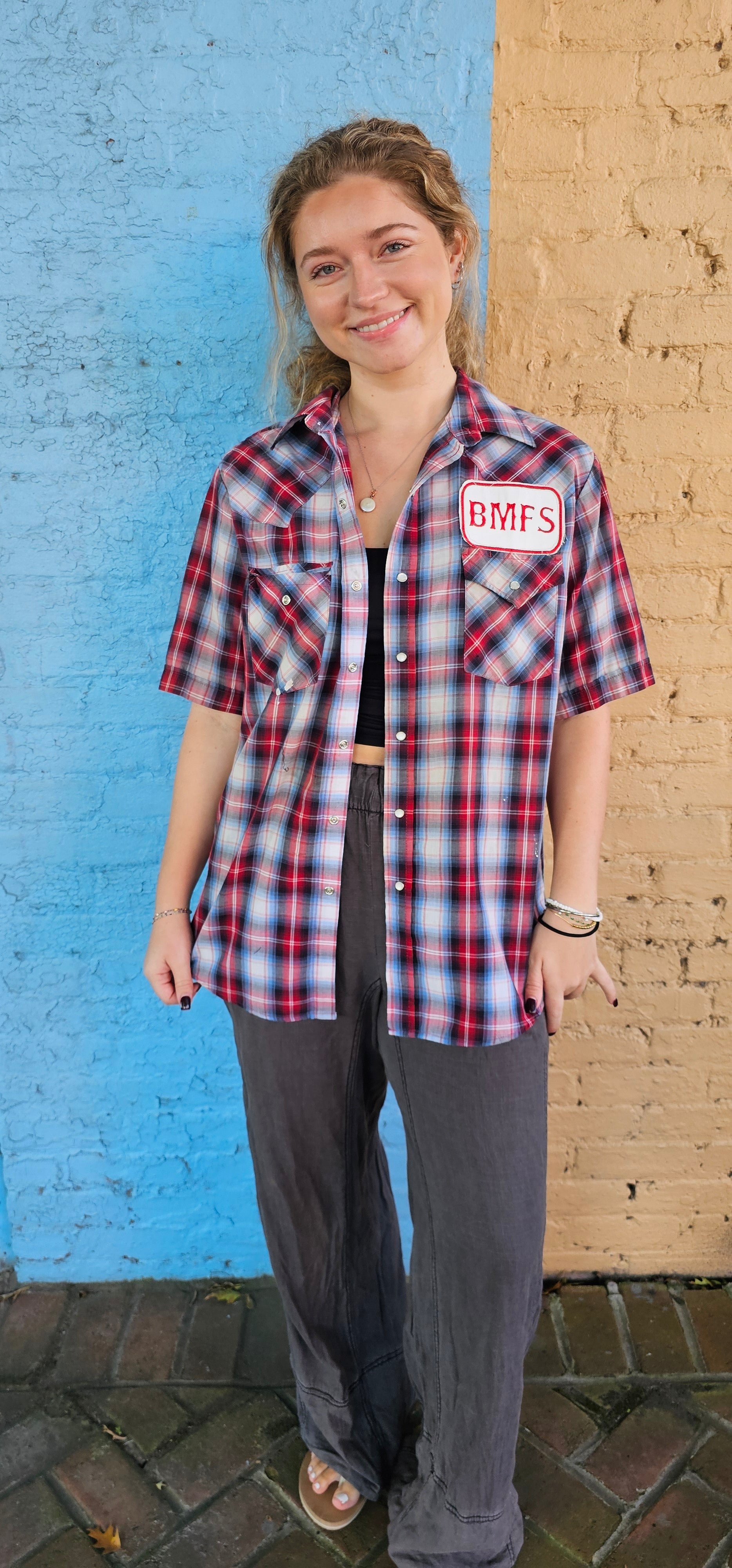 REPRESENT in our Working Man Blues shirts inspired by Billy Strings. These vintage shirts come with pearl snaps, and an embroidered BMFS patch.