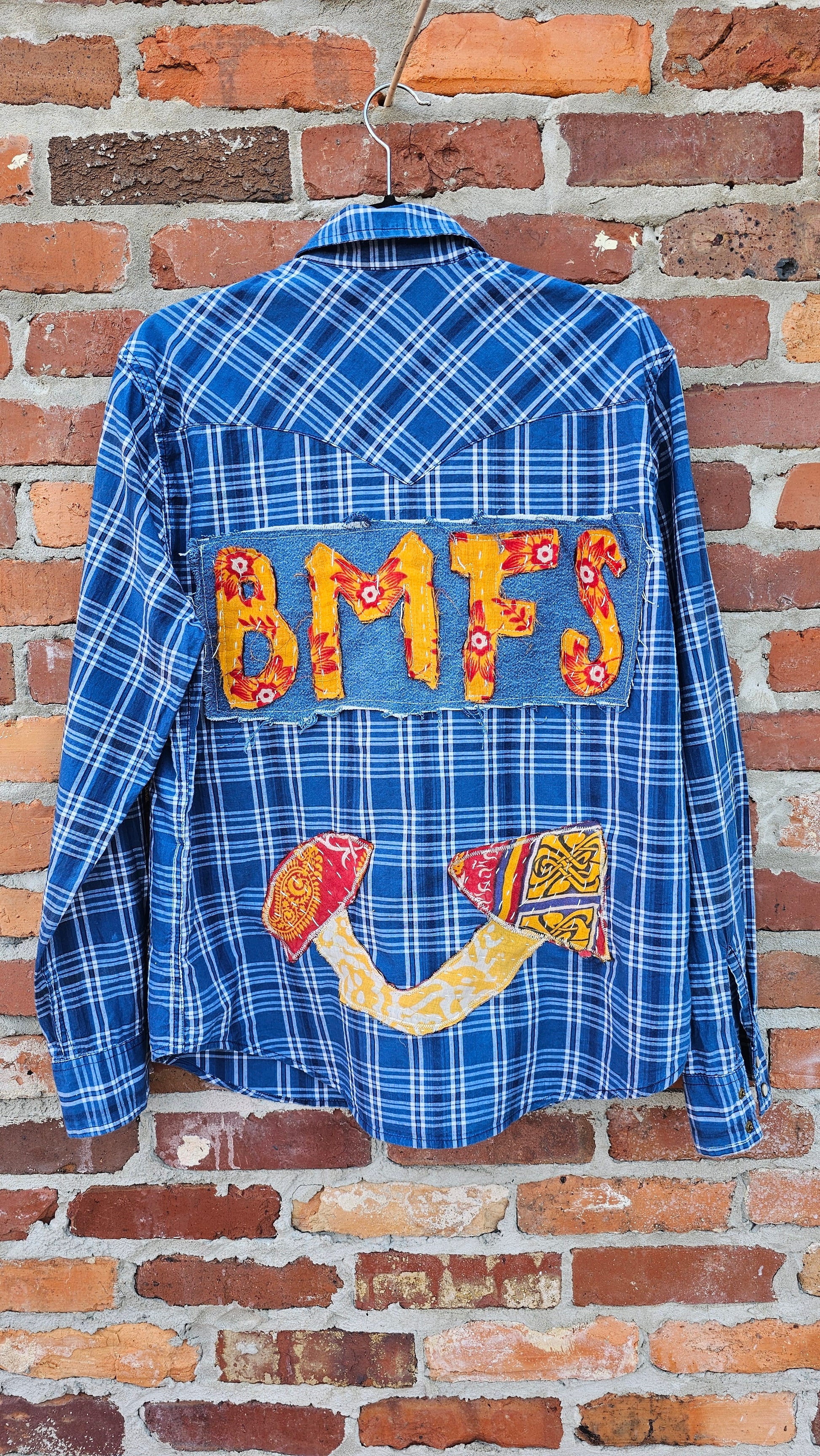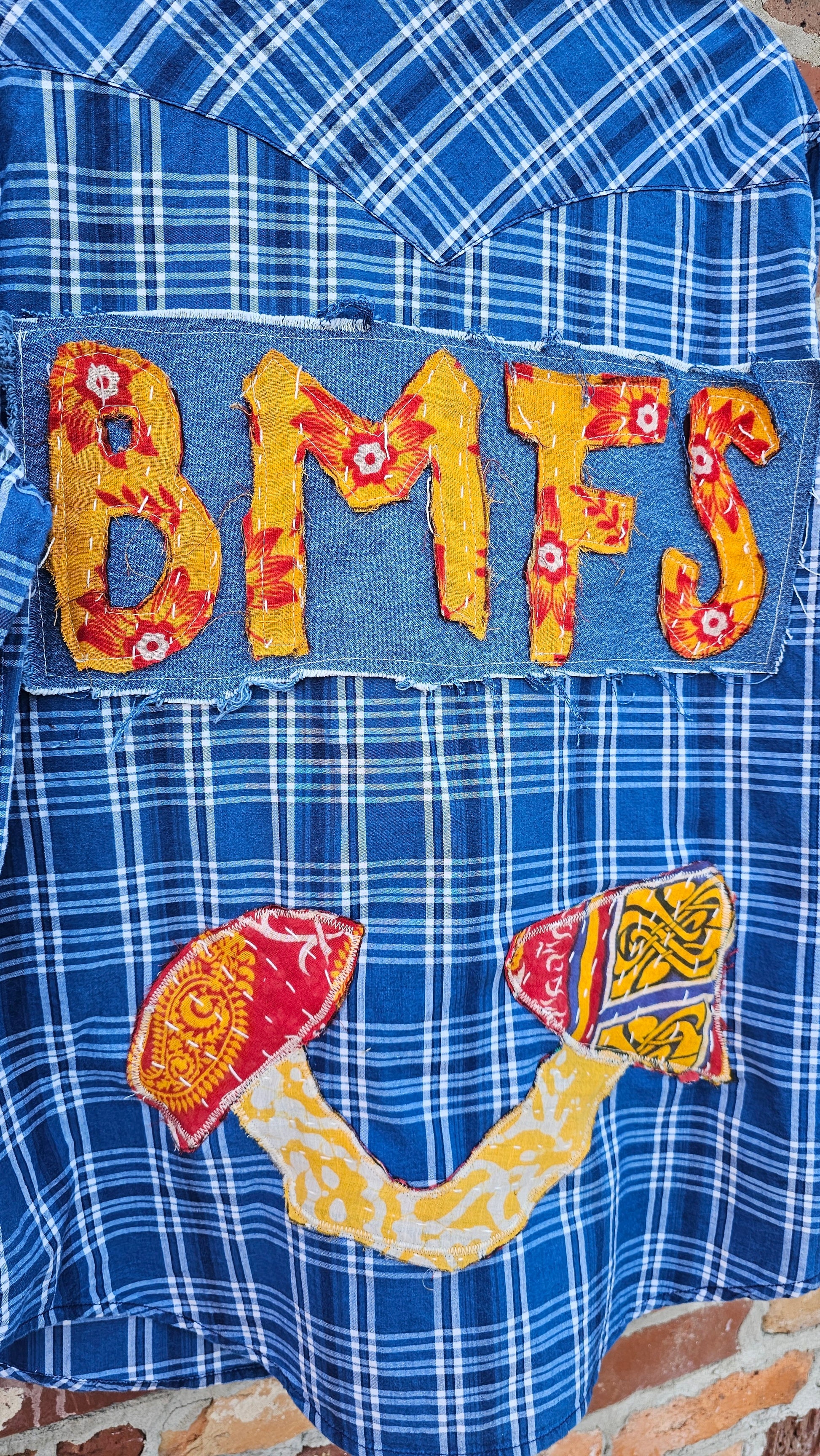 This one’s for the wild hearts. A vintage Levi’s pearl snap shirt reborn through slow fashion and creative magic. Hand-finished with BMFS kantha cut-out lettering and a whimsical kantha mushroom, this piece carries stories stitched into every thread.