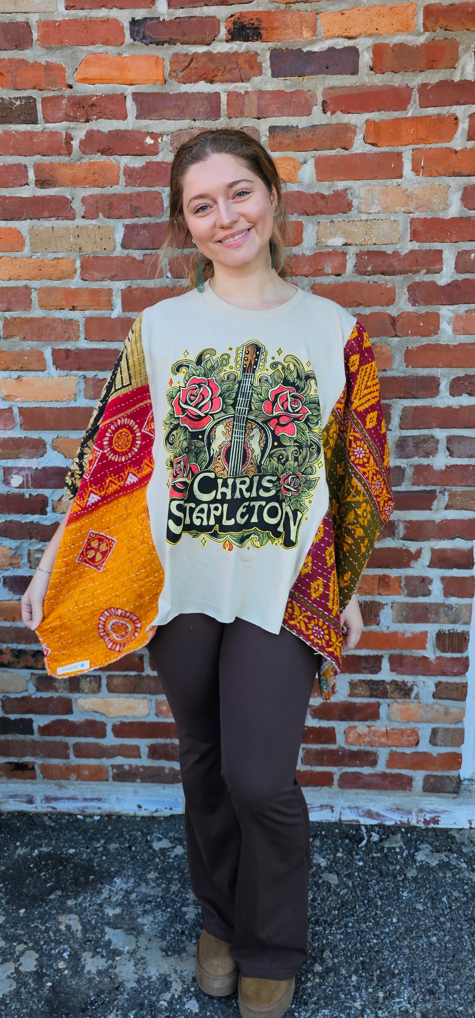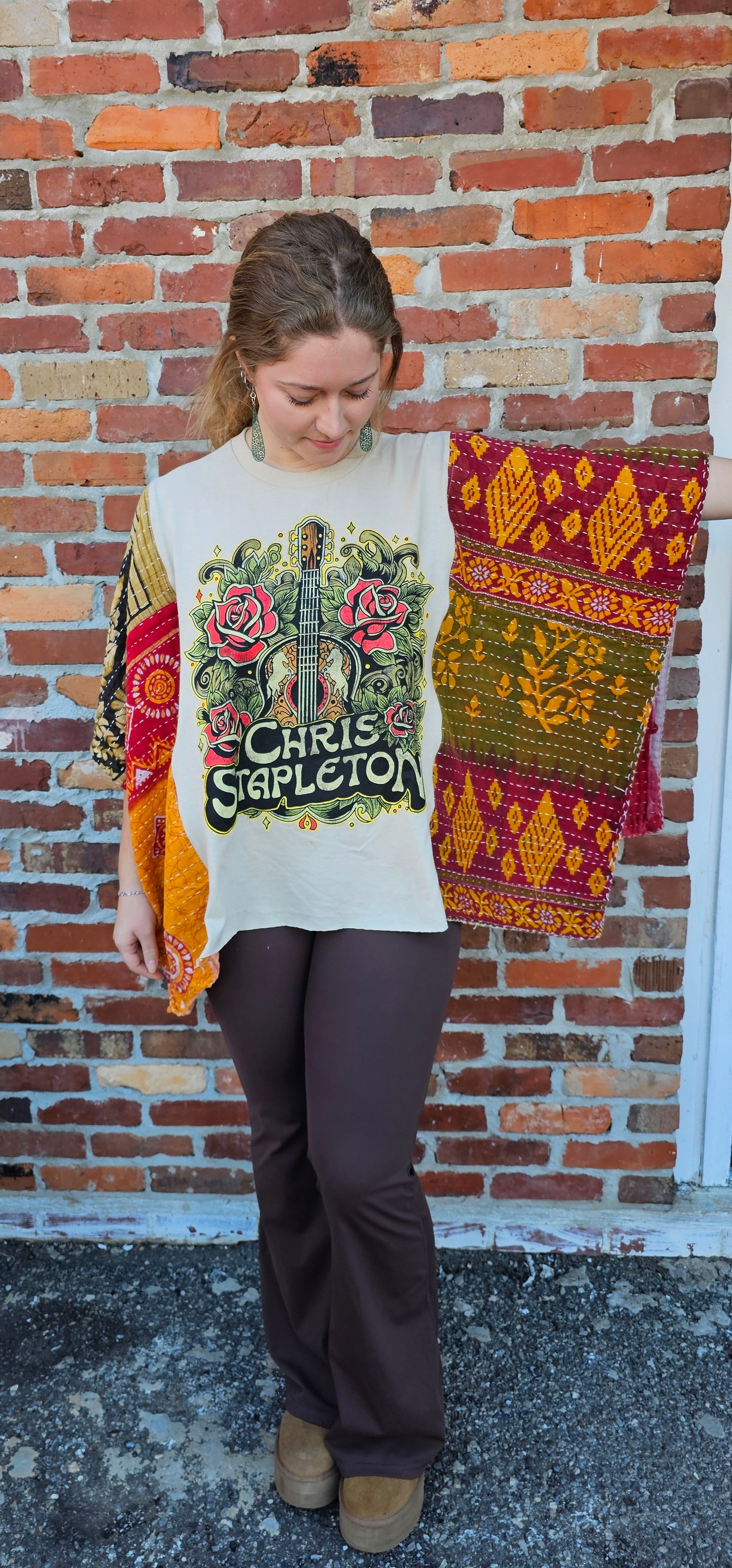 Chris Stapleton band tee. Kantha is shades of reds, browns, and creams. Kantha material is handmade from repurposed saris in India.