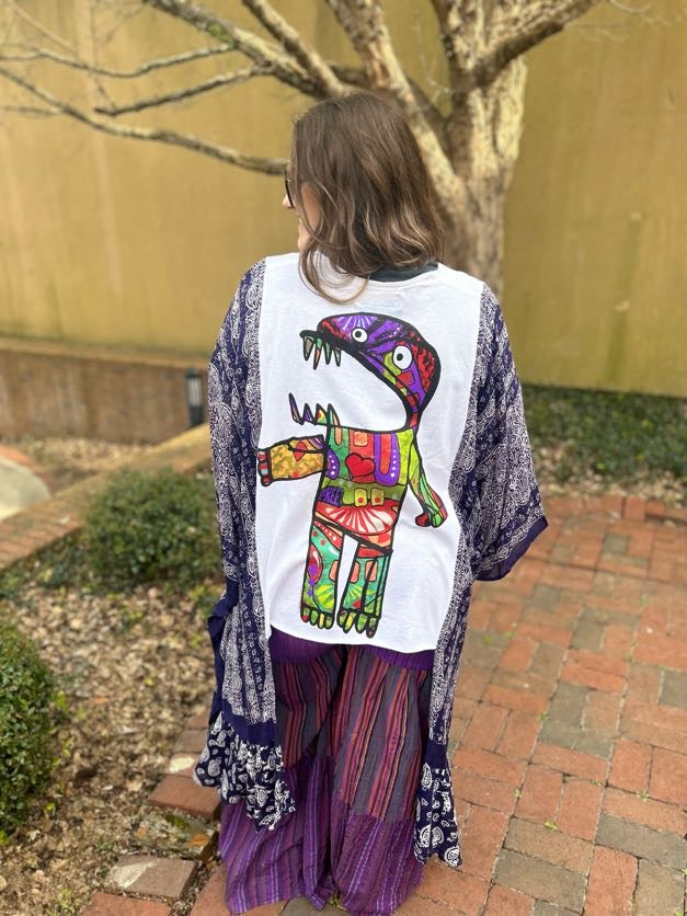 With this piece, we took a new purple kimono and styled it with a new Twiddle tee by Liquid Blue.