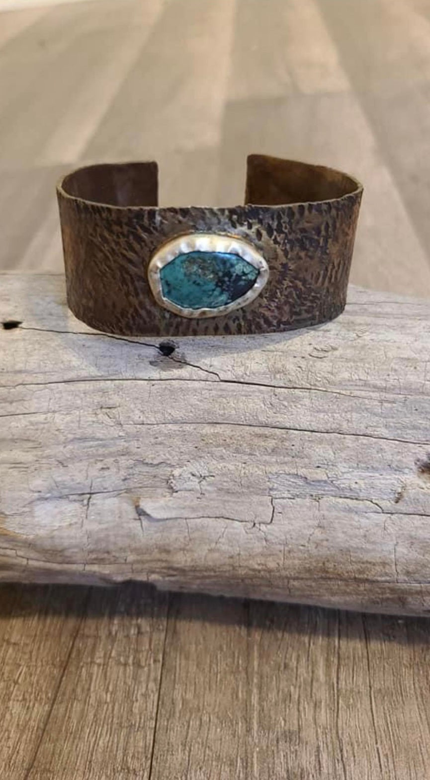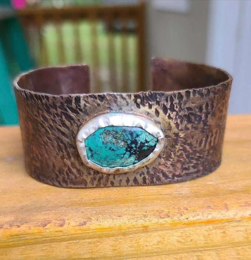 This cuff is made with copper that has been textured and patinated to give it a rustic, antique look. The stone is a beautiful Hubei turquoise stone set in a silver bezel.
