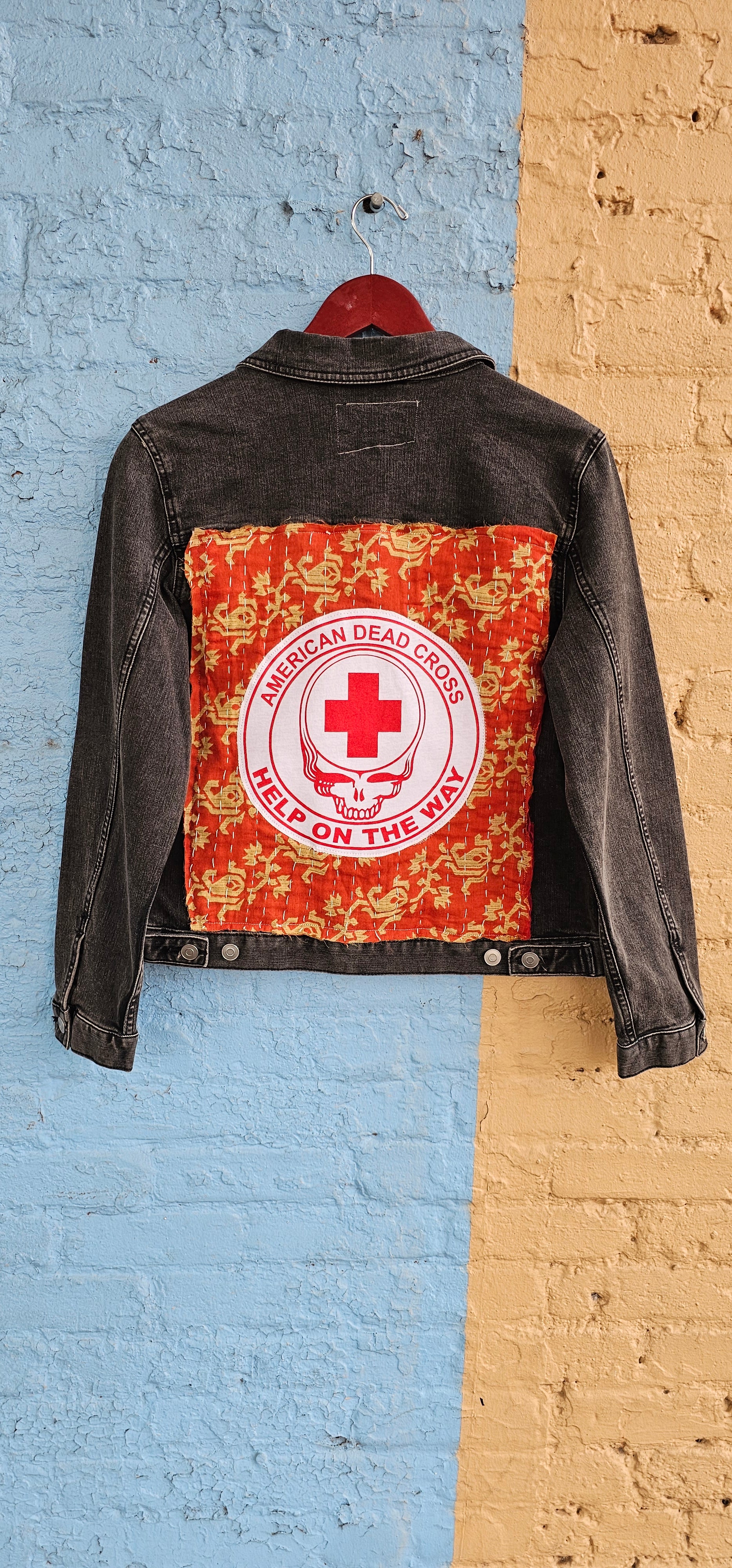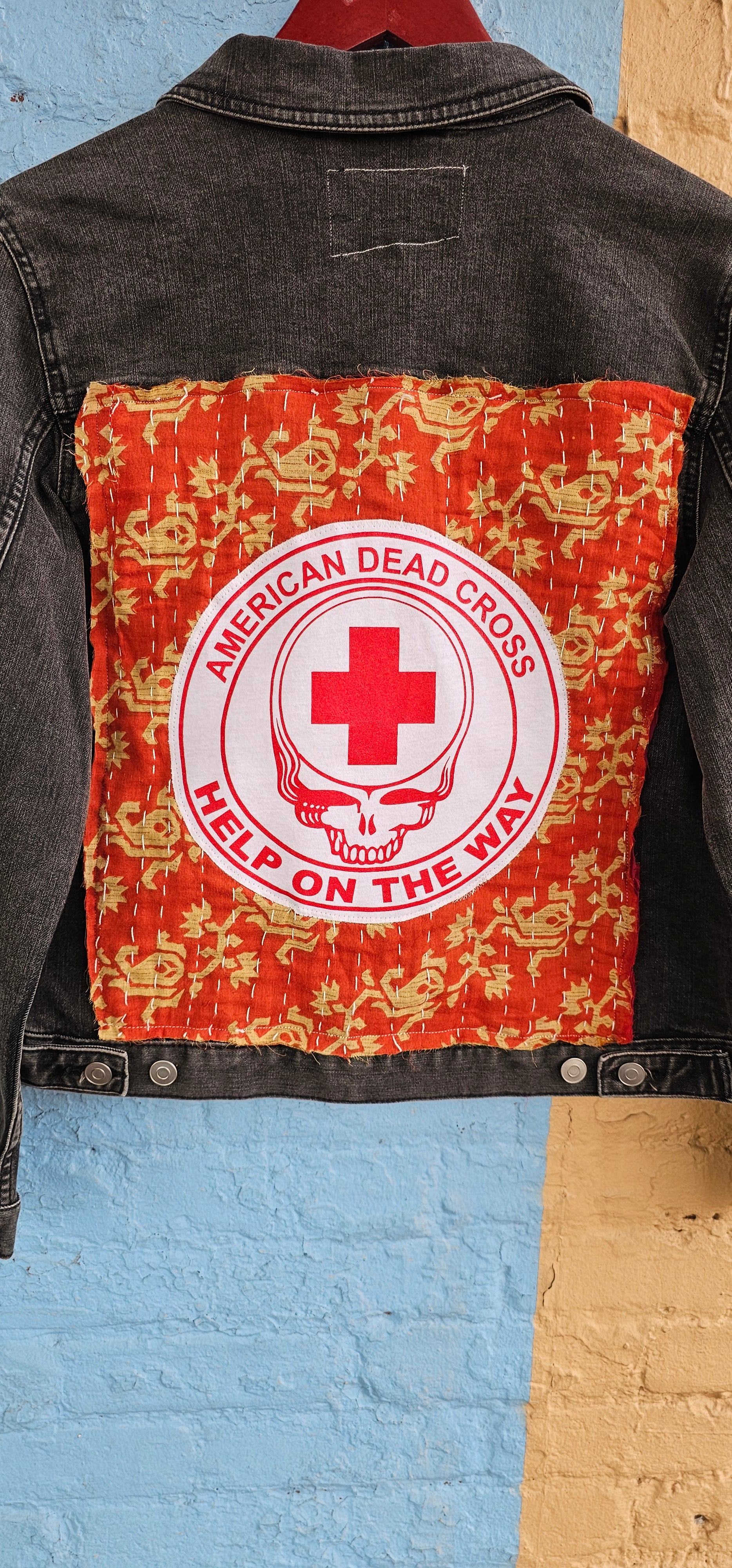 SHOW OUT in our one of a kind Grateful Dead jacket. We added our own personal touch to this size Medium jacket, NWT. Comes with Help is on the Way image from Clint Meadows. Kantha backing for accent.
