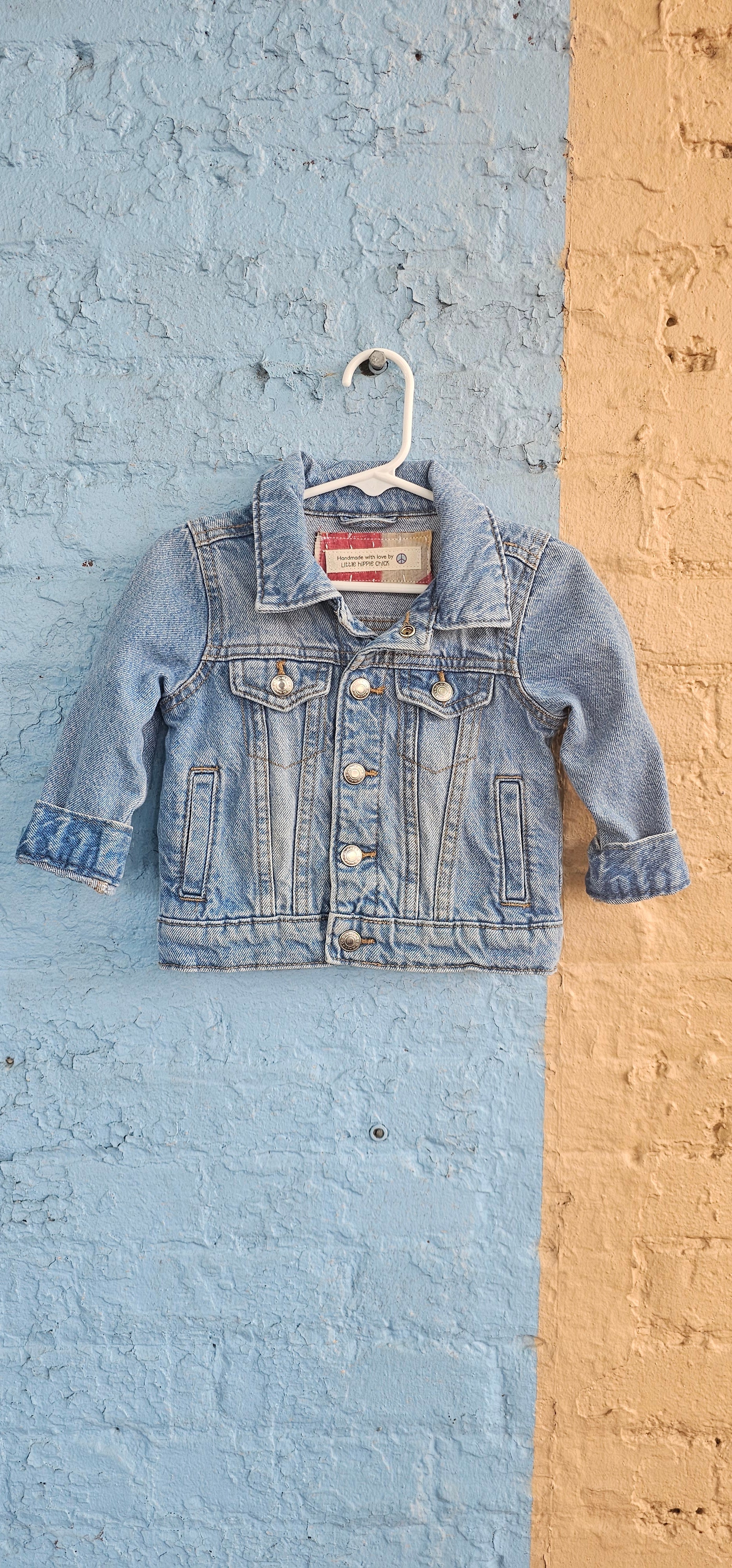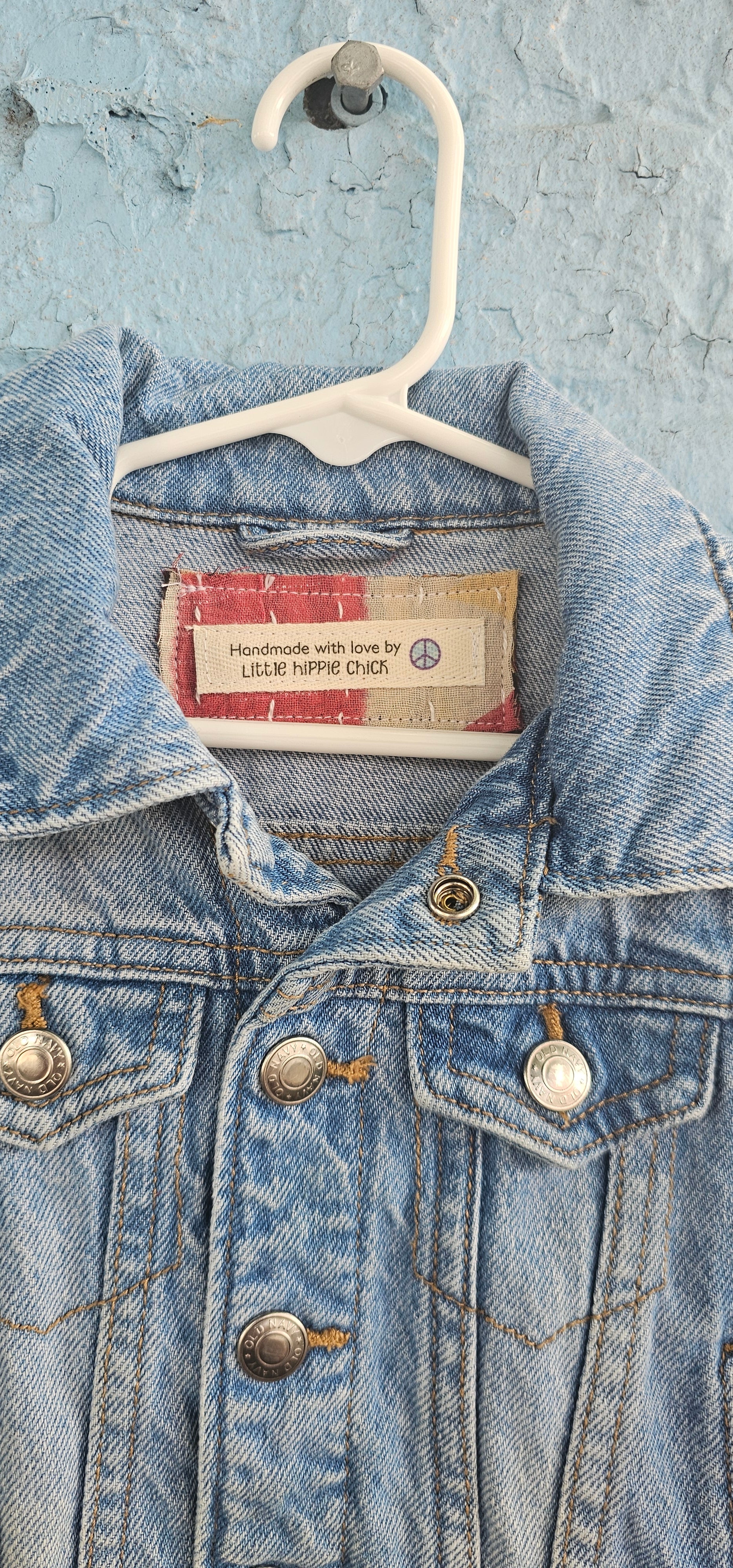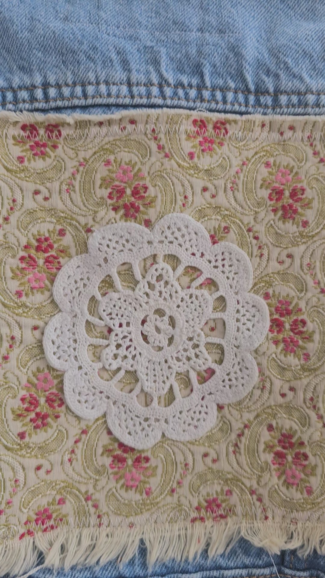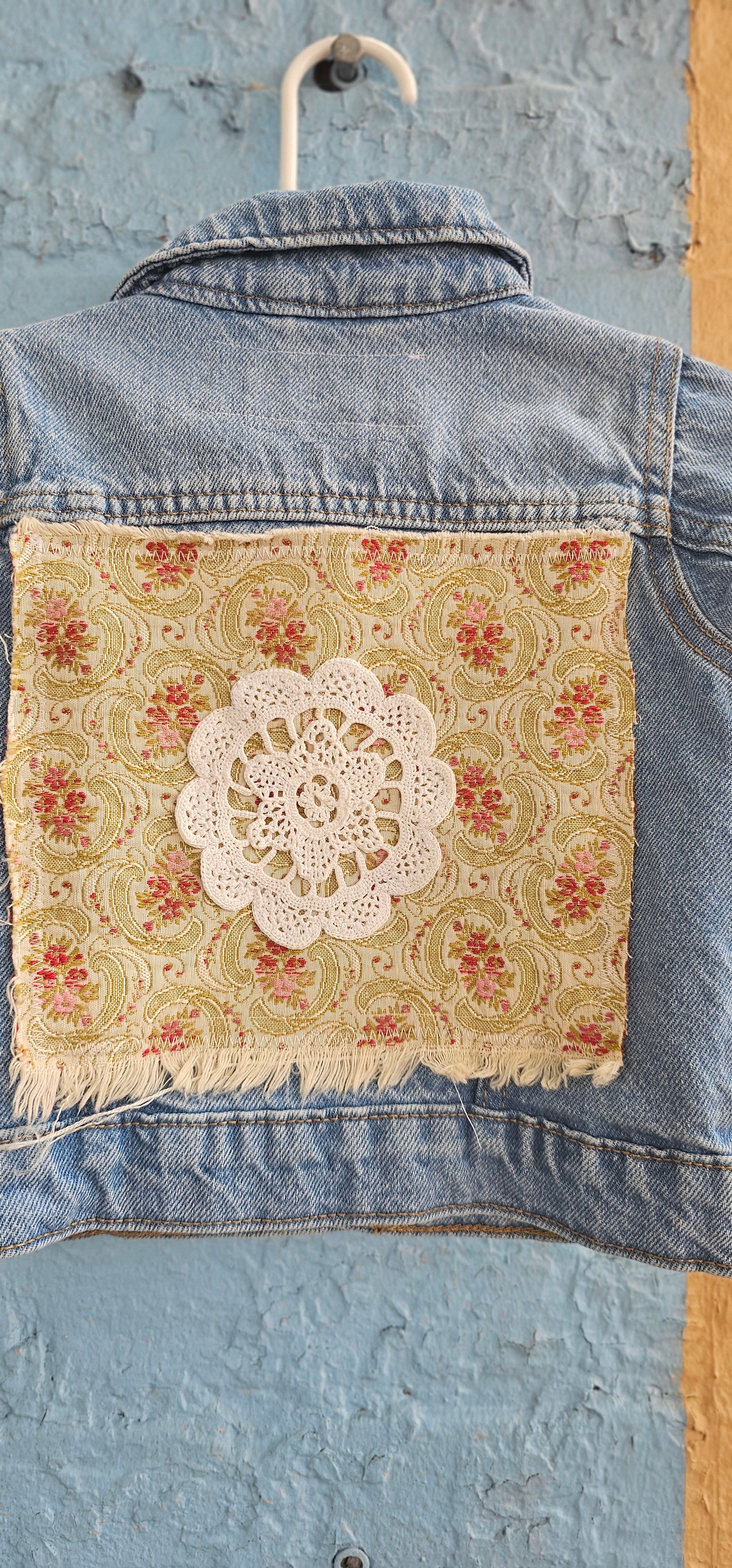 Keep your little one stylishly cozy with our Demin jacket, expertly crafted with vintage fabric and a unique handmade crochet doily accent. Perfect for ages 18-24 months, this jacket brings a touch of charm to any outfit. (Bonus: You'll love how adorable your baby looks in it!)