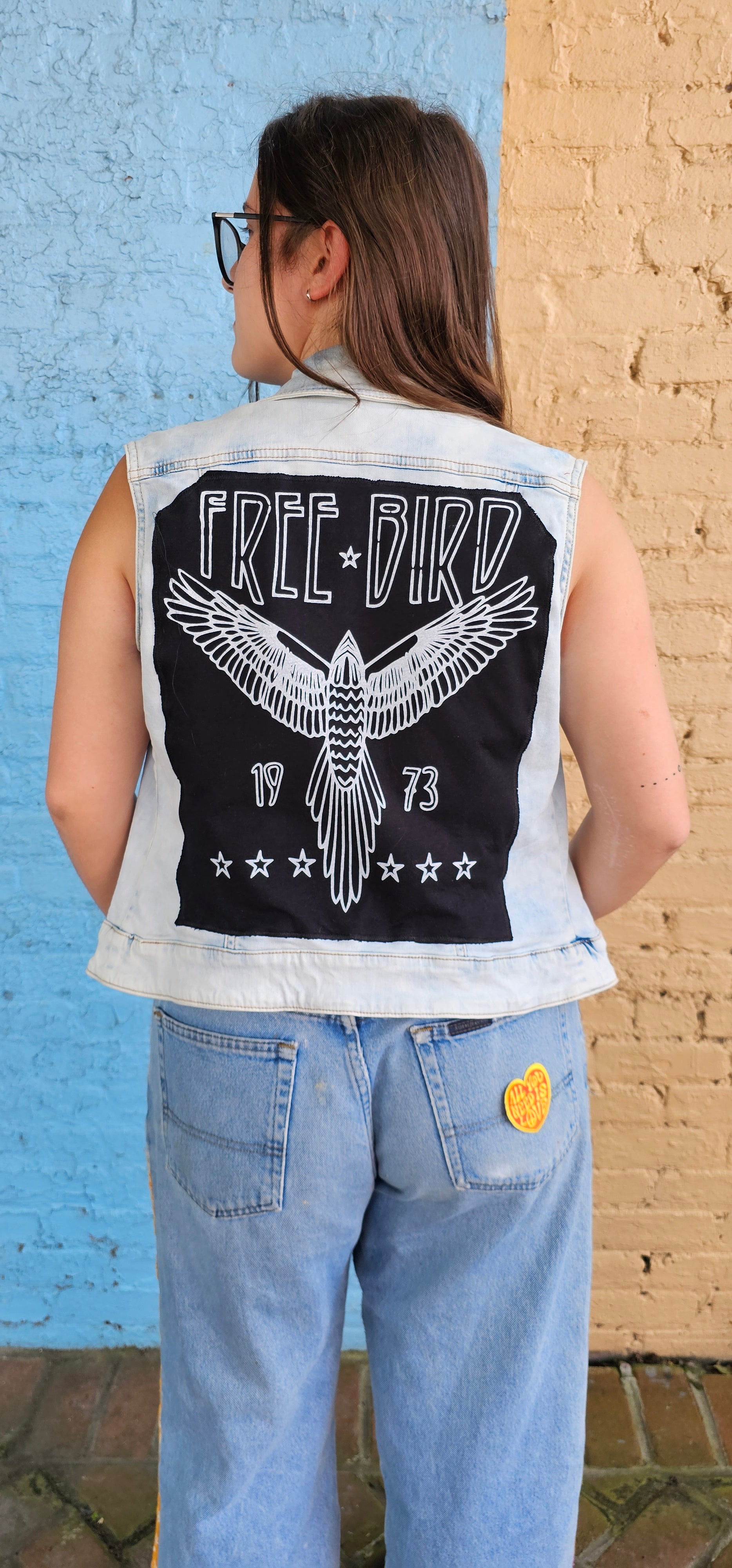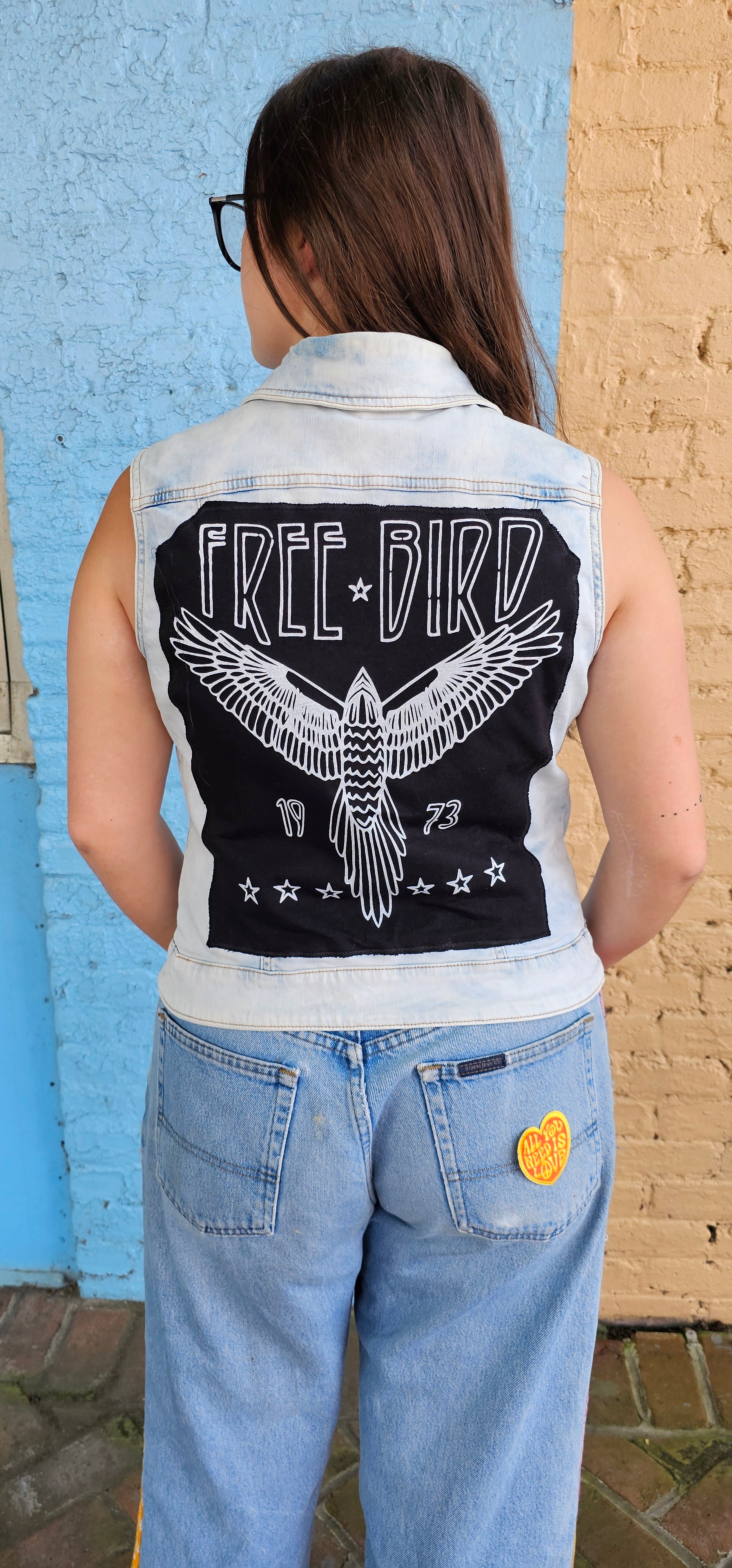 Our Freebird Denim vest is sure to turn heads. This statement piece features the popular Freebird design, inspired by the legendary Lynyrd Skynyrd. With a button down front and double front pockets, it offers both charm and functionality.