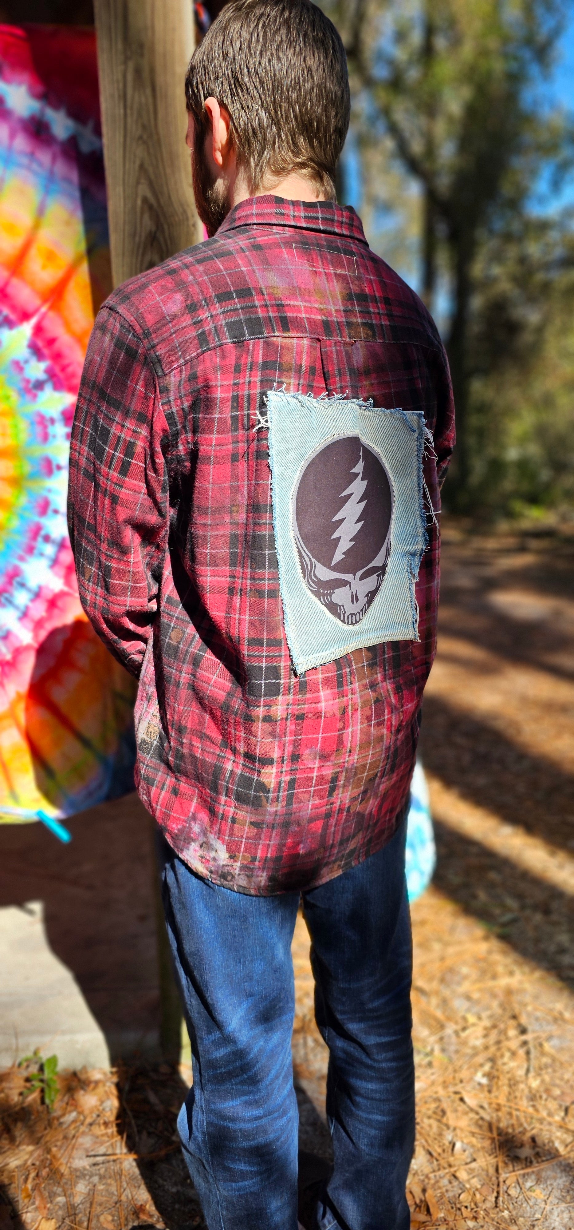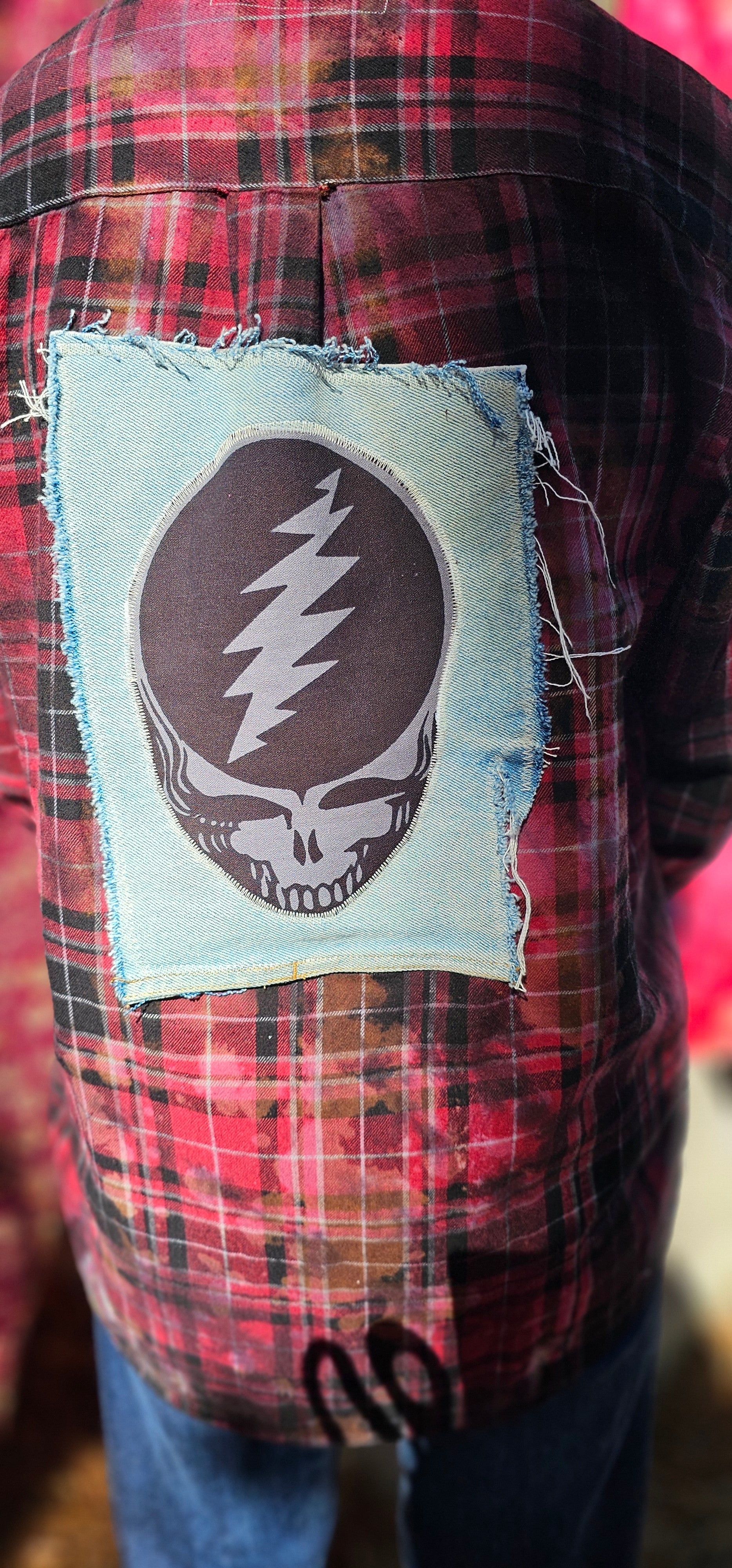This is your new favorite shirt! It is a size Large and READY TO SHIP. Flannel is mix of reds and maroons. Has black and grey stealie on the back with denim accent.