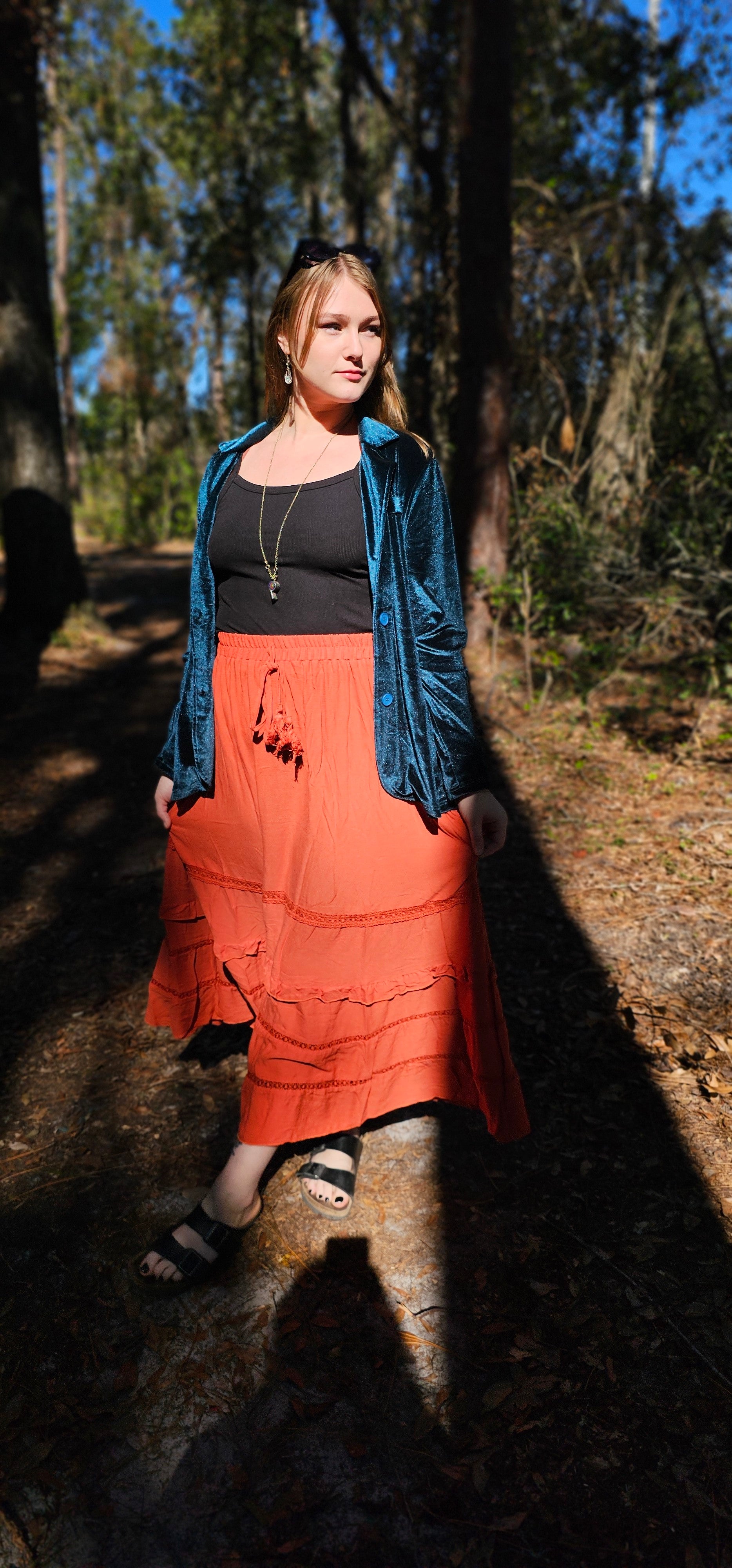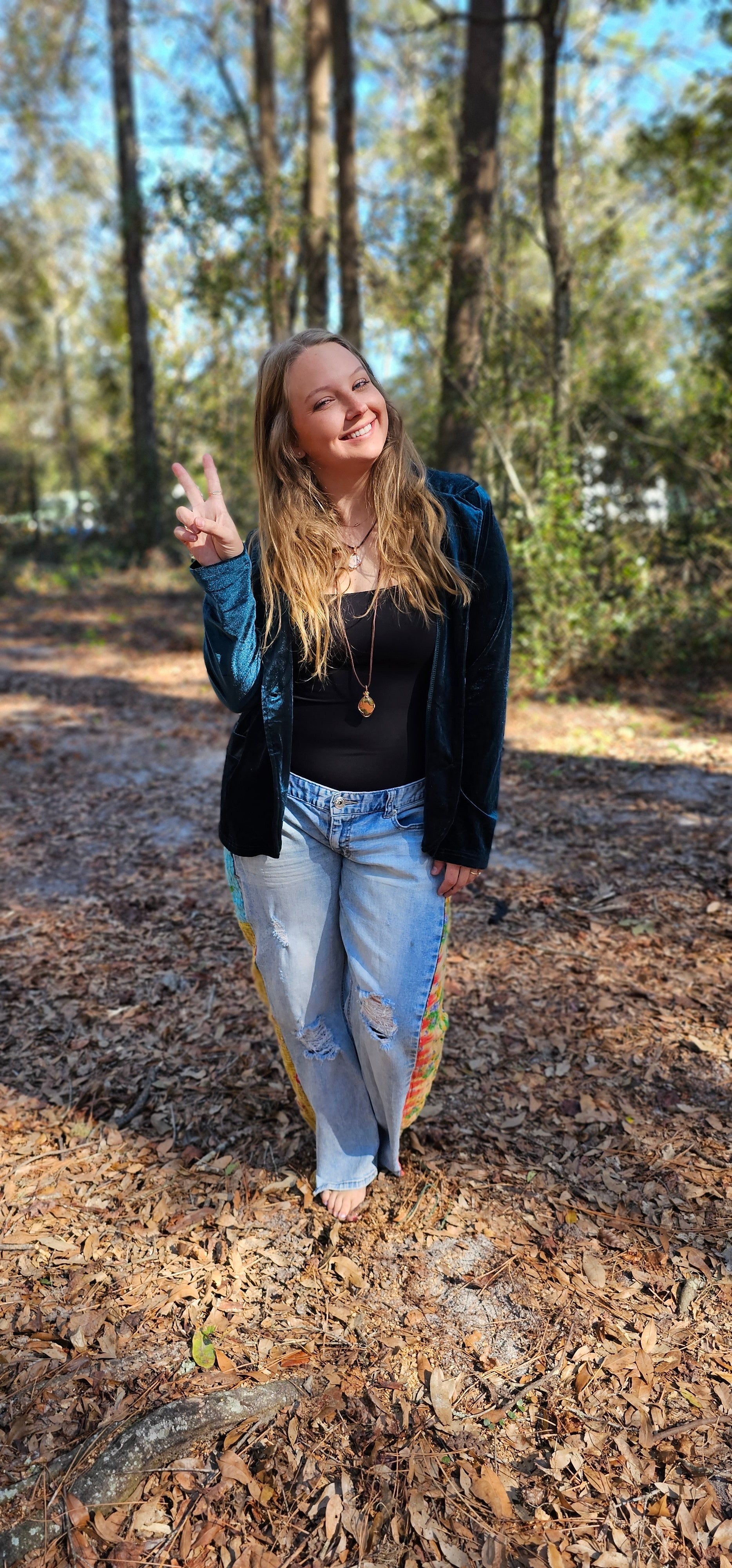 Who doesn't love a velvet blazer? We took this BEAUTIFUL teal colored velvet blazer, and turned it into the perfect blazer for the Dead Head in your life. Since we cannot throw away a single piece of our kantha fabric, we cut a 13 point bolt out of this colorful piece and added it to the blazer.
