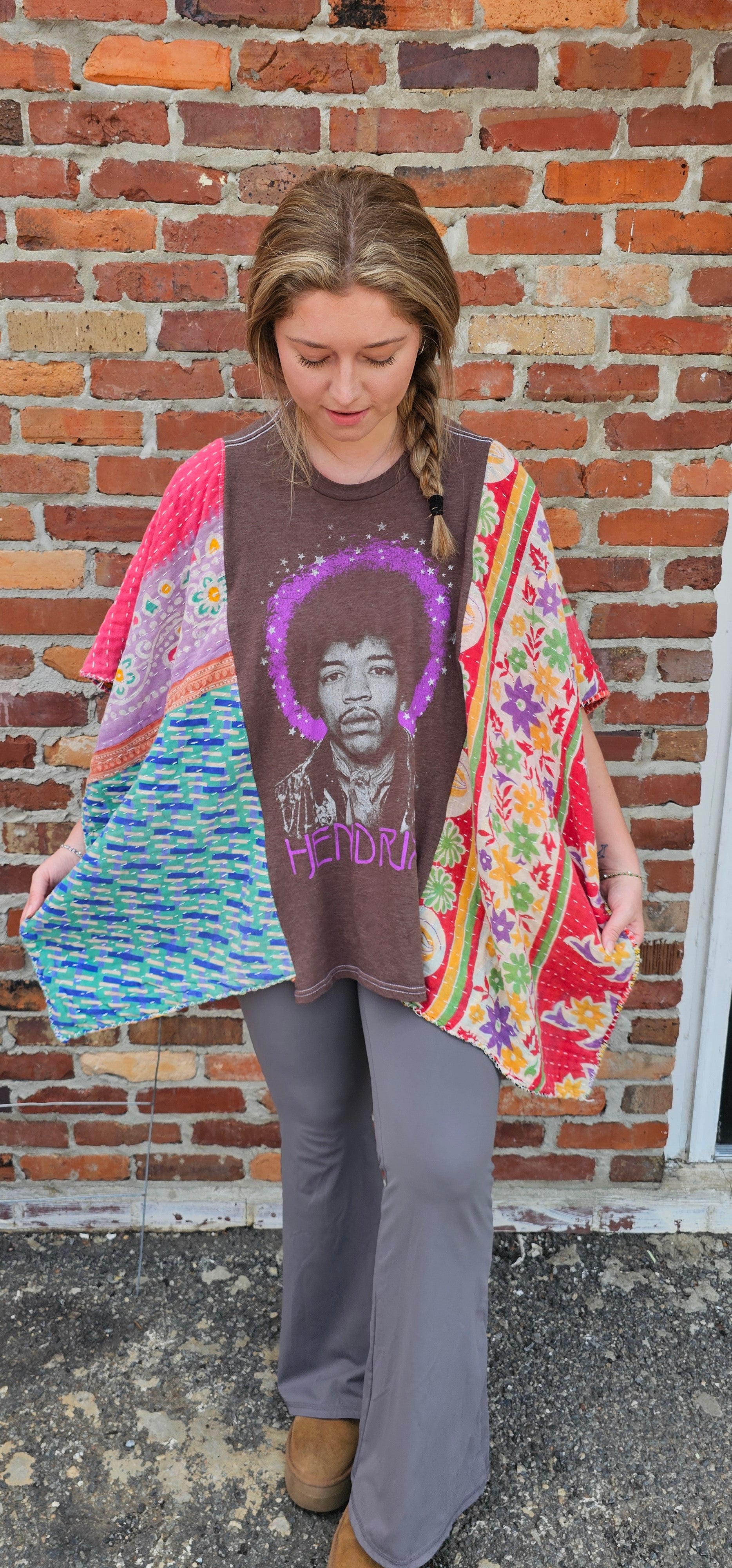 Jimi Hendrix band tee. Kantha is shades of reds, pinks, yellows, blues, greens, purples. Kantha material is handmade from repurposed saris in India. Lots of groovy flow!