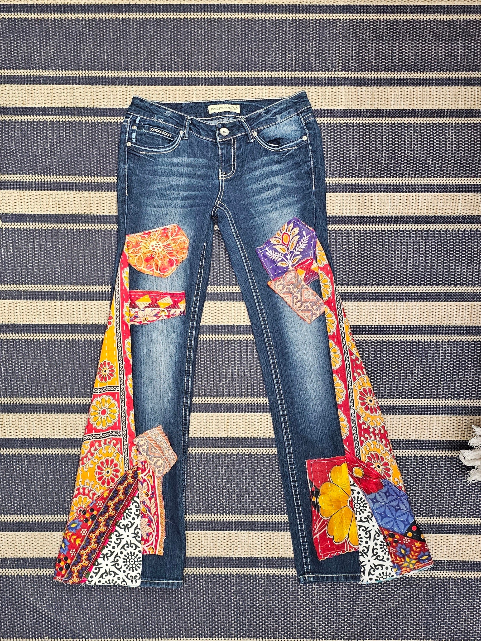 Stand out in our handcrafted Party Pants — unique upcycled jeans featuring authentic kantha patchwork and dramatic bell-bottom inserts made from vintage kantha quilts.