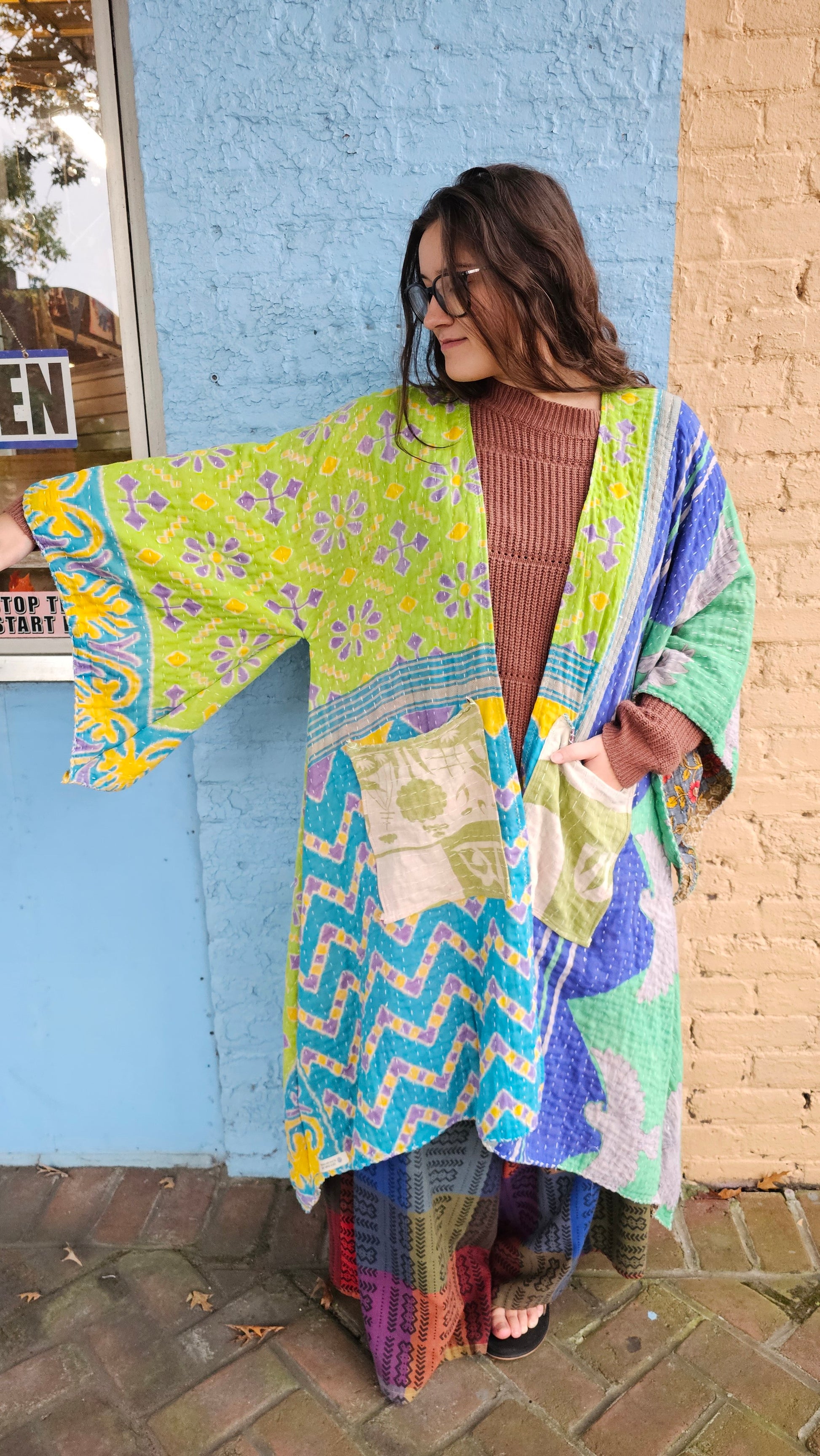 Our Kantha Kimono has tons of beautiful colors in it. So roomy and comfy. Features 2 pockets for comfort and storage! REVERSIBLE