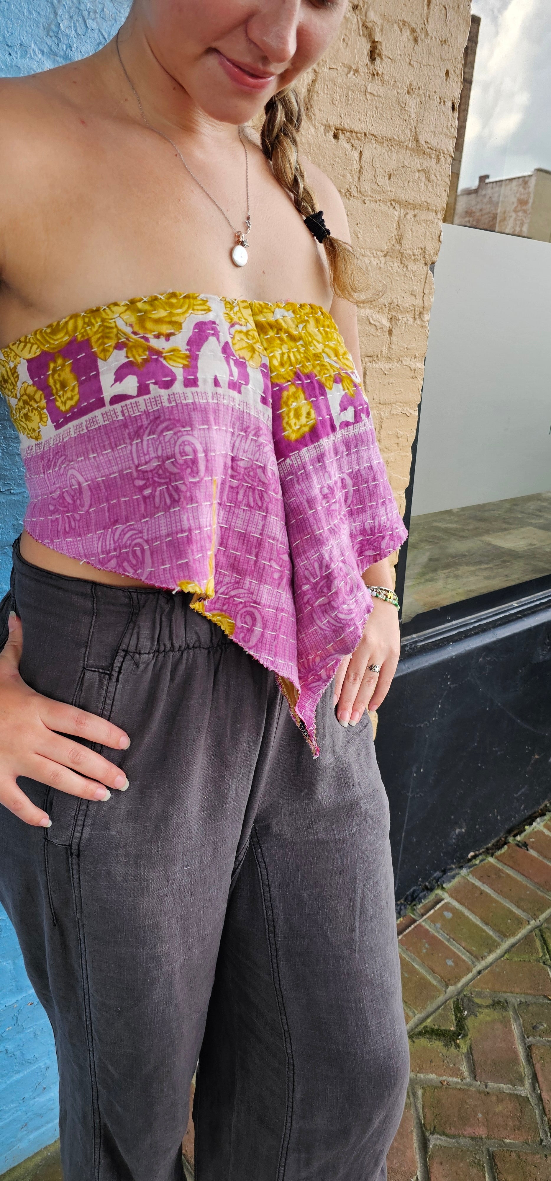 Radiating free-spirited charm, the Kantha Solstice Top is a one-of-a-kind piece handcrafted from recycled Kantha scrap fabric. Each top carries the story of vibrant textiles pieced together in a patchwork design, giving it a soulful, earthy feel that’s as unique as you are.