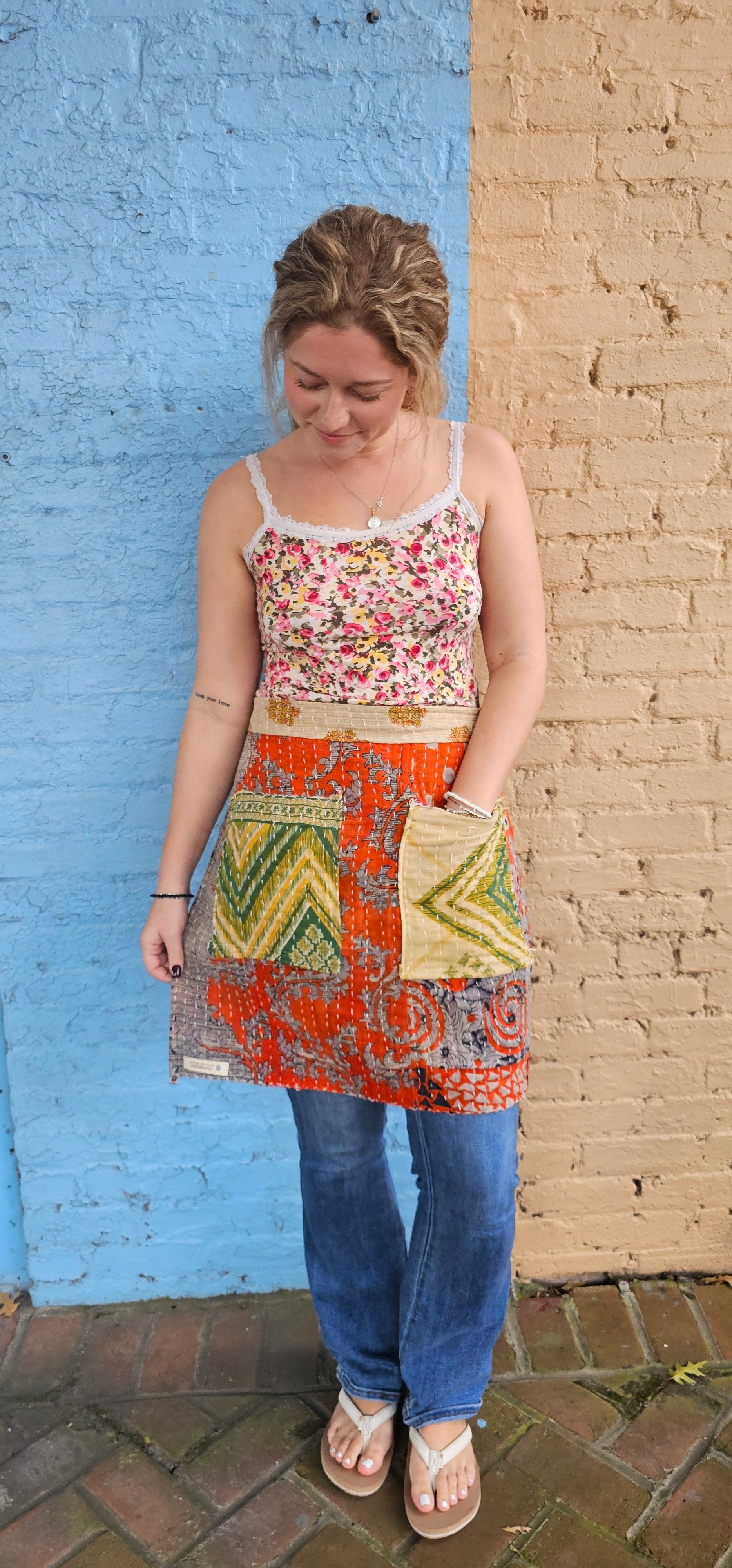 Add a splash of charm to your kitchen with this handmade Kantha Waist Apron! Featuring convenient pockets and an adjustable waistband, it's a perfect fit for all your cooking adventures. Each apron is one of a kind, stitched with love and playful style to brighten your day while keeping you mess-free.
