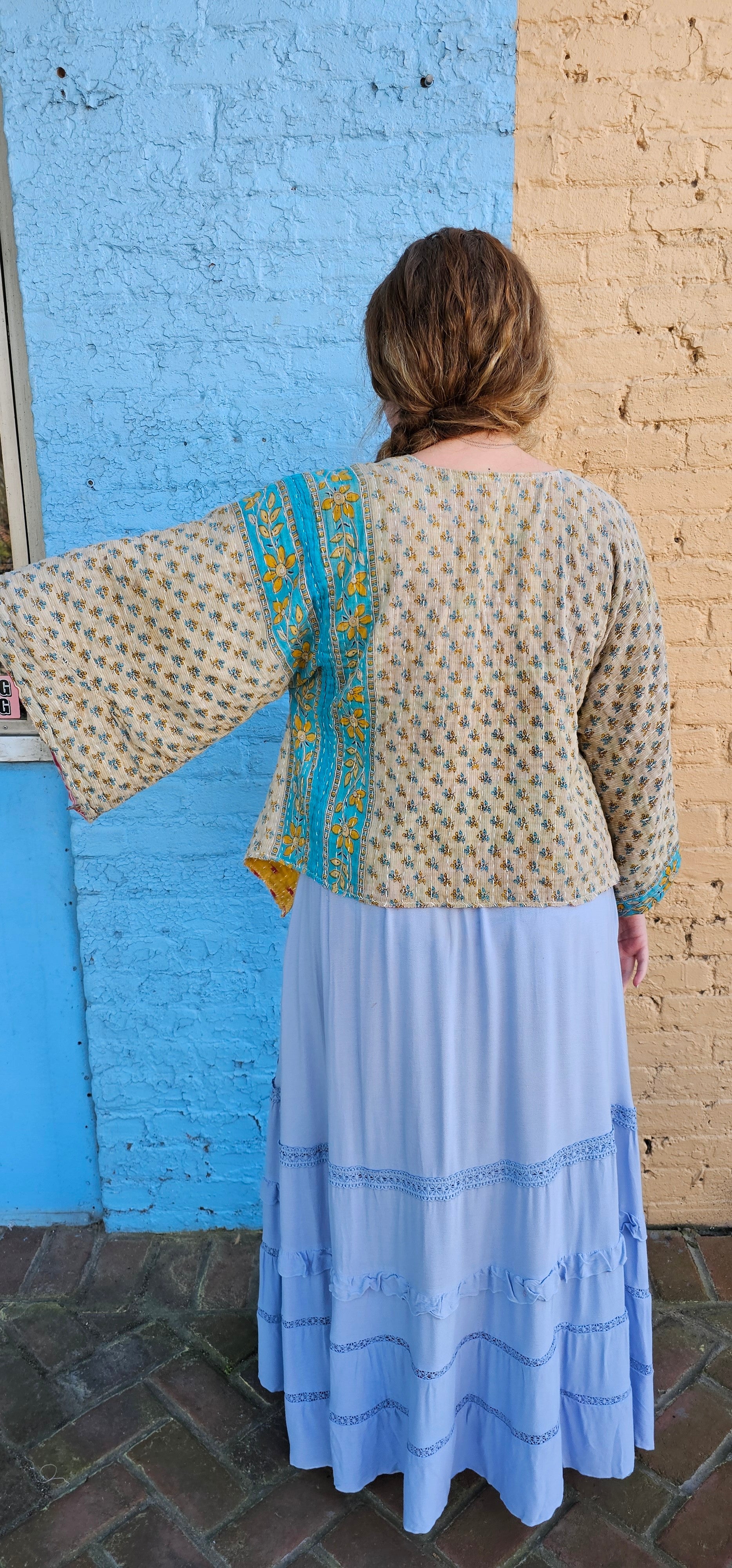 Introducing our new Kantha Cardigan. It is a funky and versatile option for free-spirited fashionistas. This Little Hippie Chick original design is reversible so it can be worn two ways for twice the fun. Hits right at the waist. The front is cut at an angle for extra coverage. Features our traditional bell sleeve.
