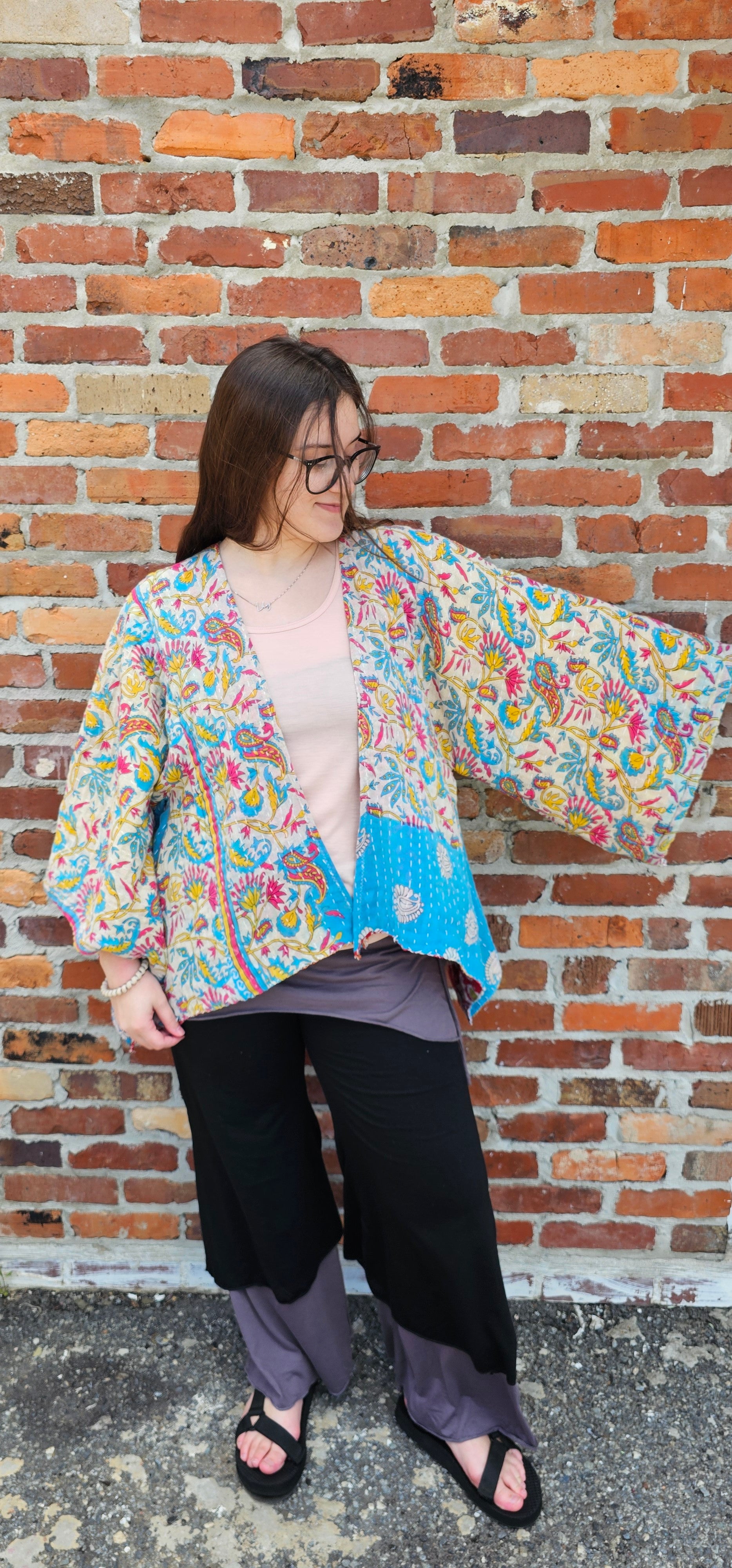 Introducing our new Kantha Cardigan. It is a funky and versatile option for free-spirited fashionistas. This Little Hippie Chick original design is reversible so it can be worn two ways for twice the fun. Hits right at the waist. The front is cut at an angle for extra coverage. Features our traditional bell sleeve.