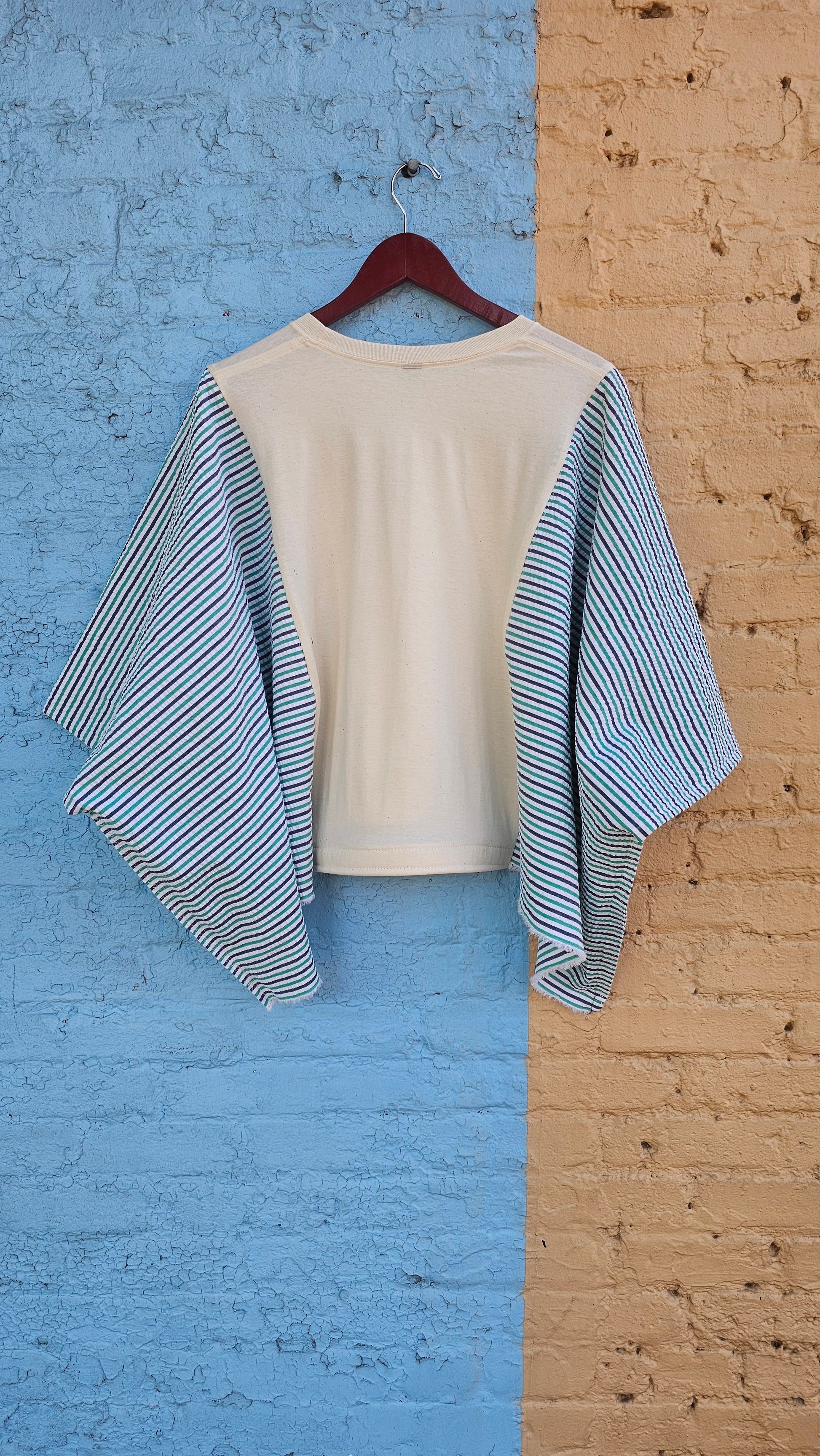 The look is finished with lightweight seersucker sleeves, adding texture and a subtle structured flow that makes this top stand out in all the right ways. The cropped silhouette keeps it playful and easy to style, while still giving you that signature relaxed, boho energy.