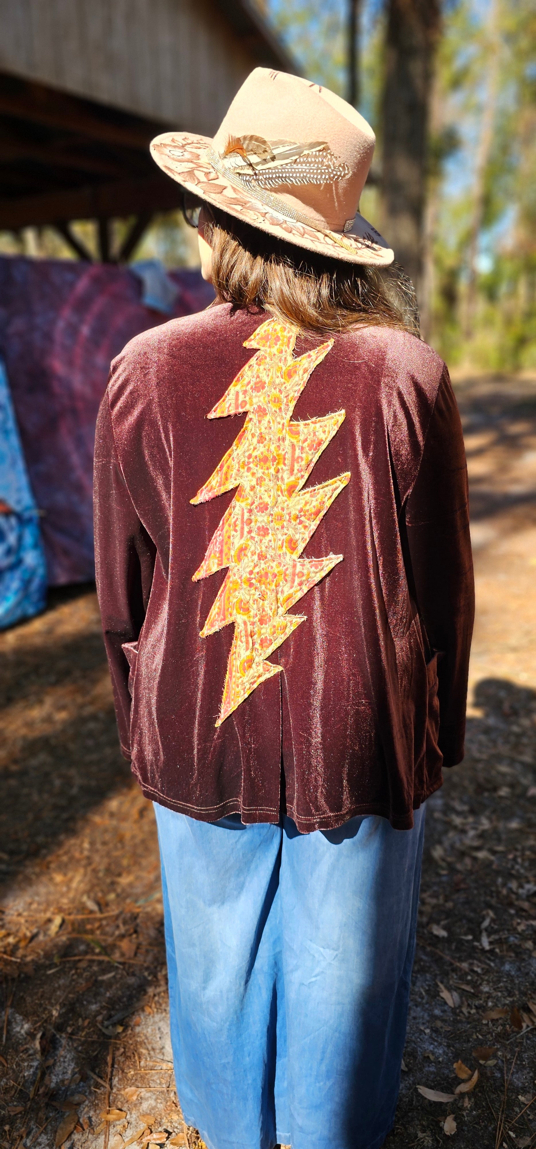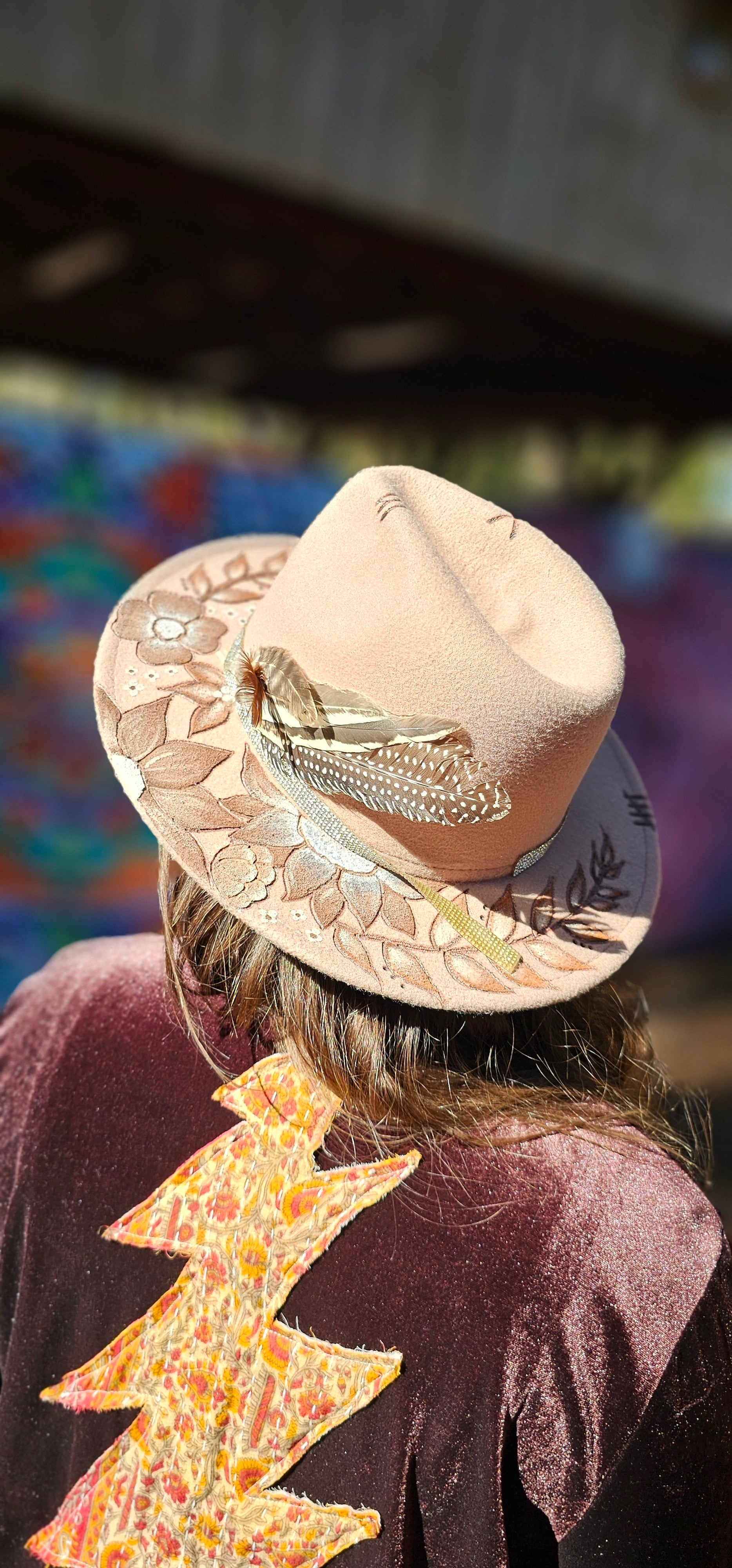 This amazing little statement piece is a felt hat, burnt and painted with flowers.