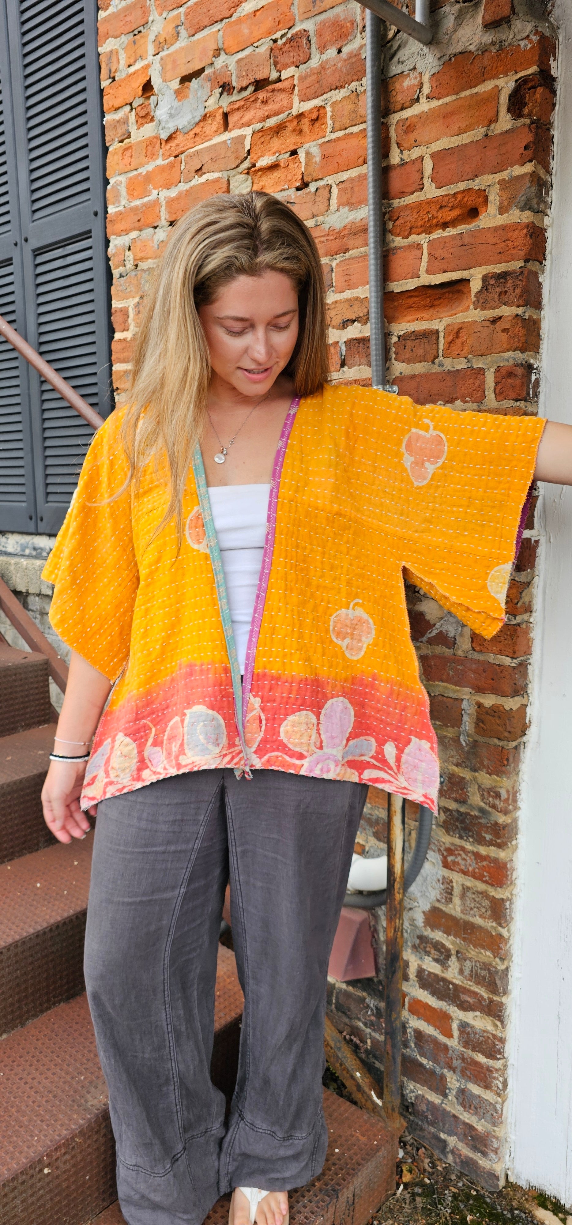 Our Charmer Cardie is the perfect blend of our cardigan and waistcoat! Featuring an open front and shorter bell sleeves, this one-of-a-kind layering piece is stitched from upcycled vintage saris using traditional Kantha embroidery. REVERSIBLE AND ONE OF A KIND