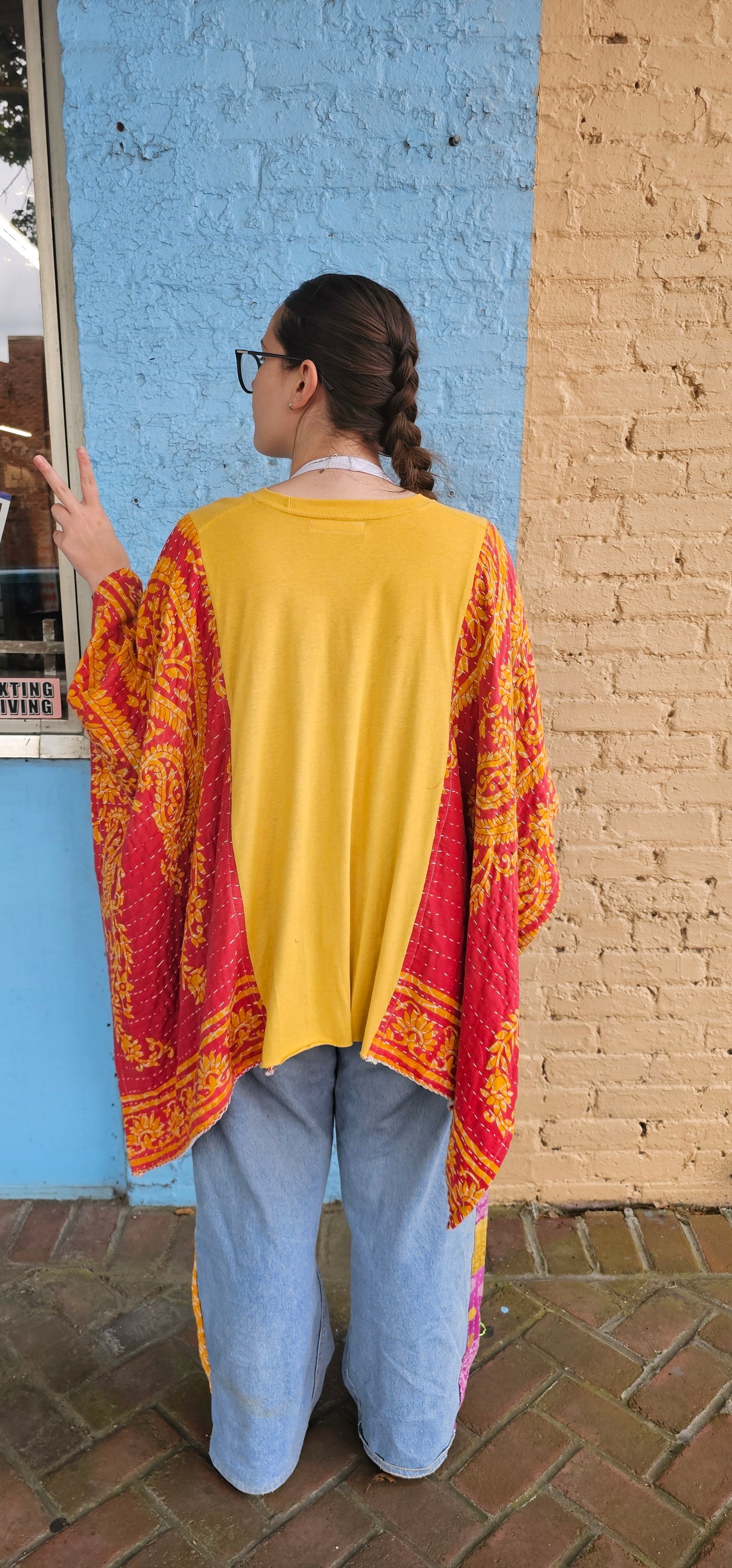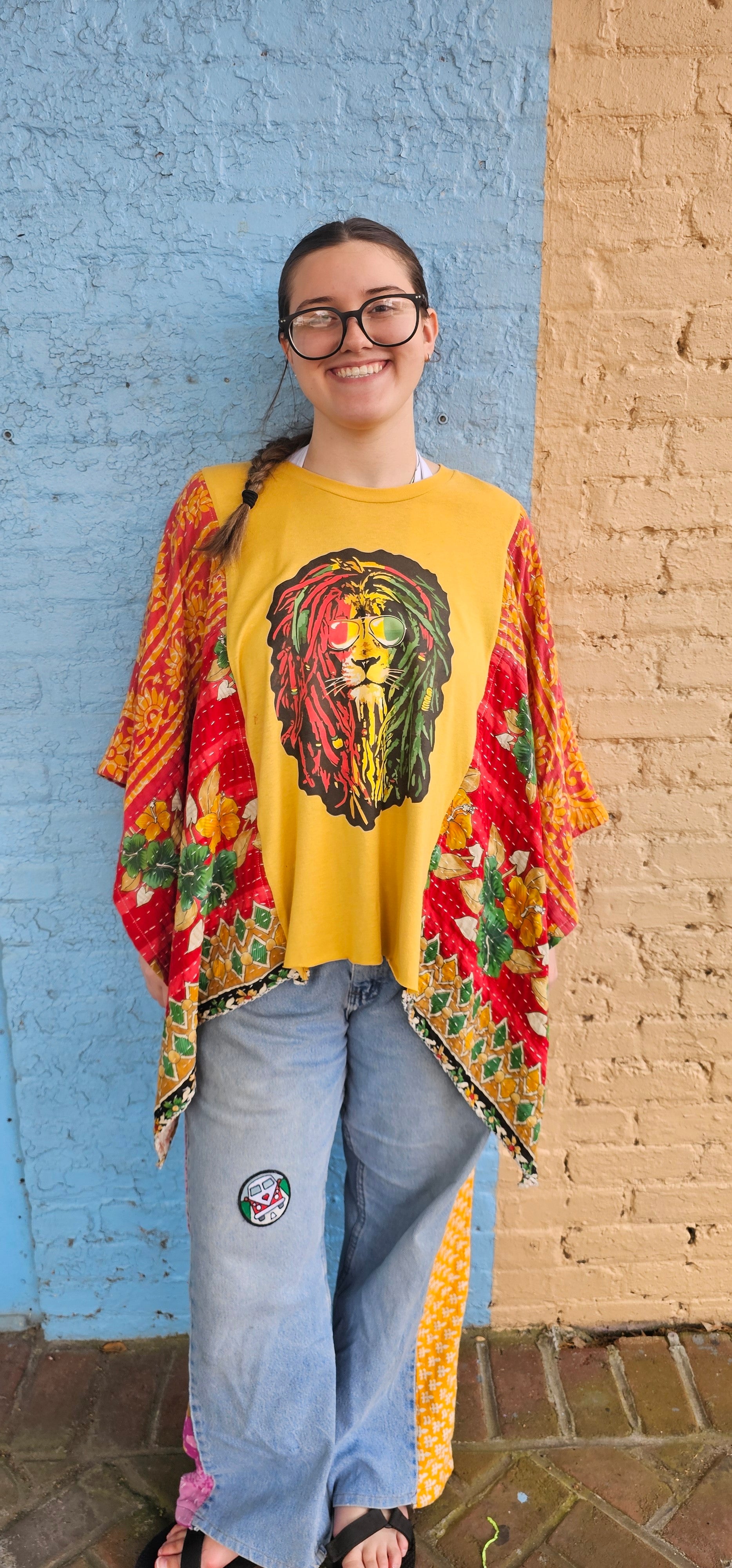 Rasta Lion tee. Kantha is shades of reds, greens, and yellows. Kantha material is handmade from repurposed saris in India.