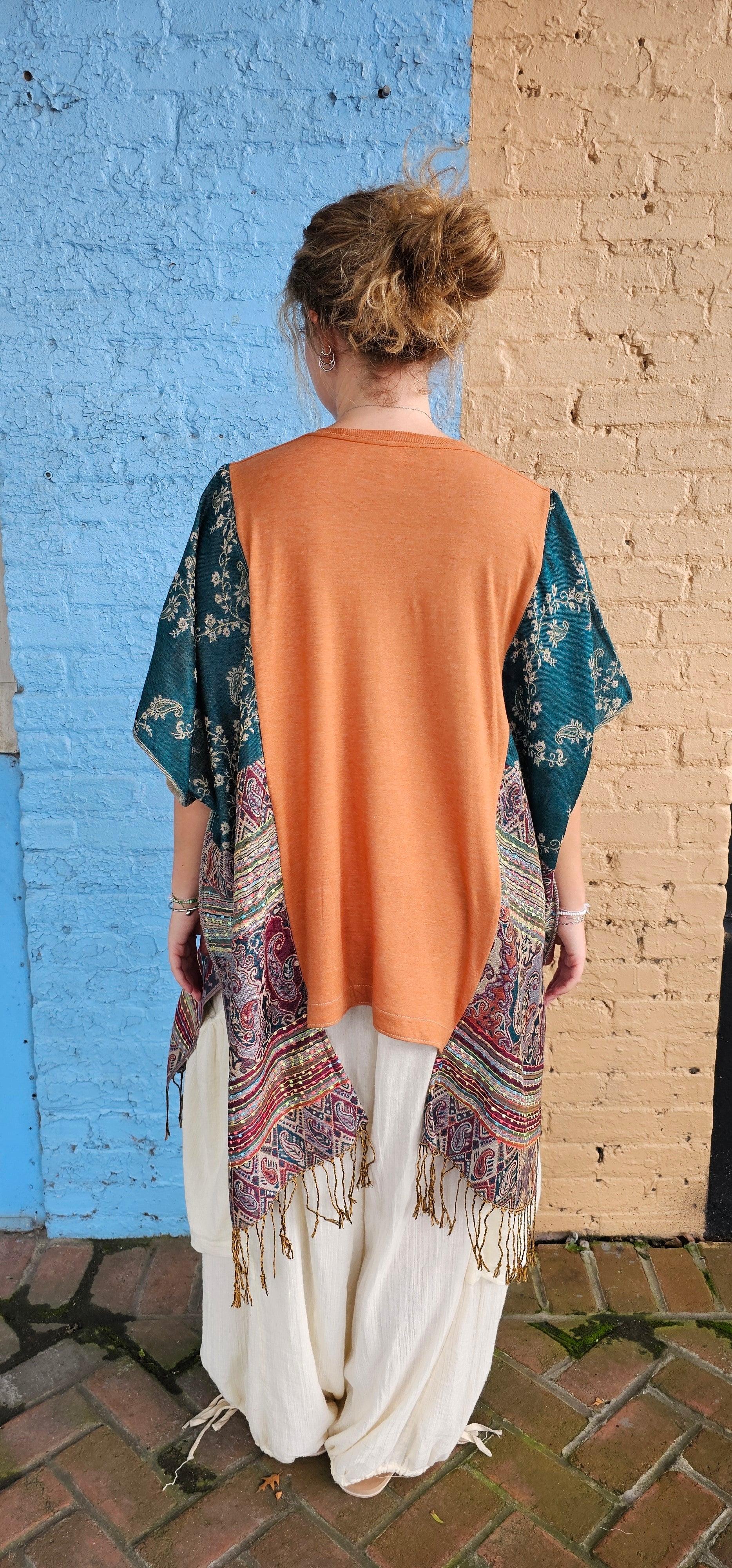 Each top is stitched down the sides to give a poncho feel, but worn as a shirt.