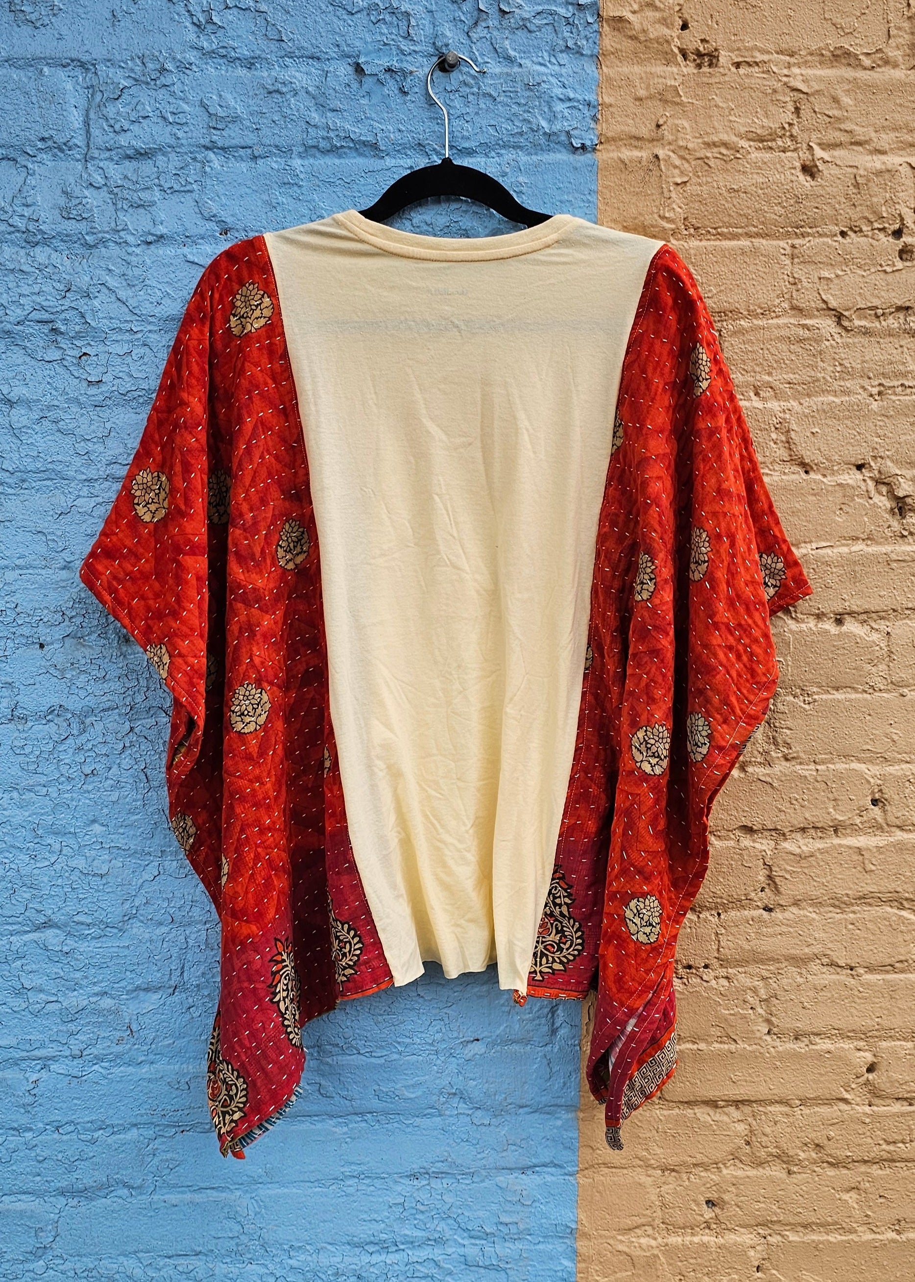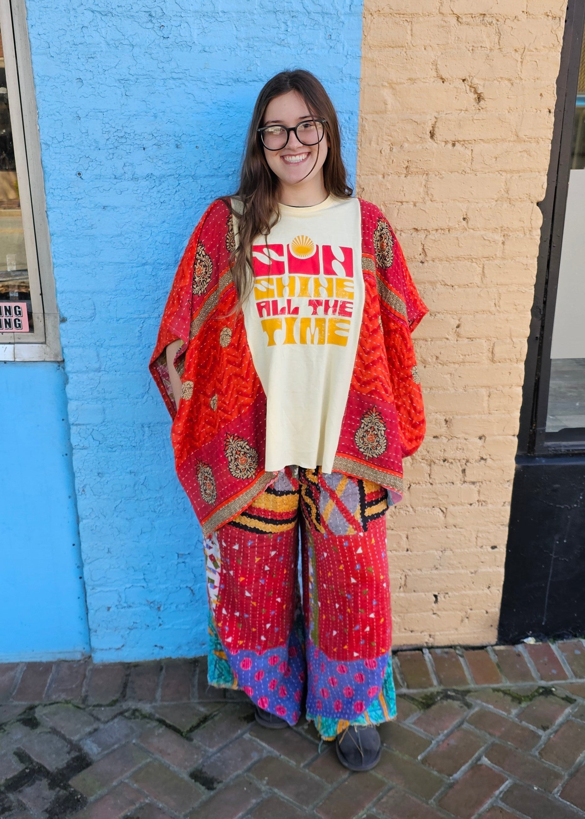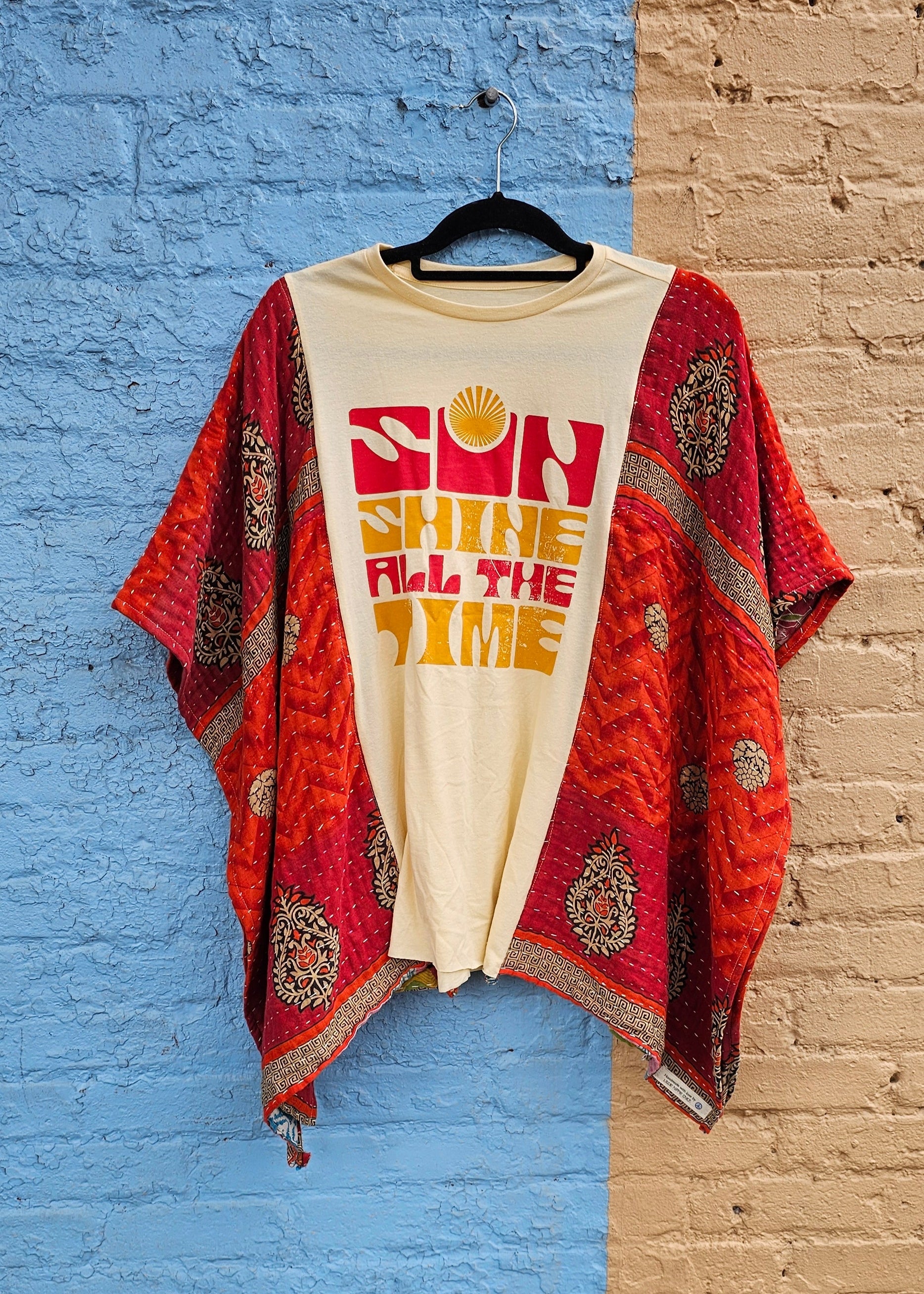 Sun Shjne All the Time graphic tee. Pale yellow. Kantha material is handmade from repurposed saris in India