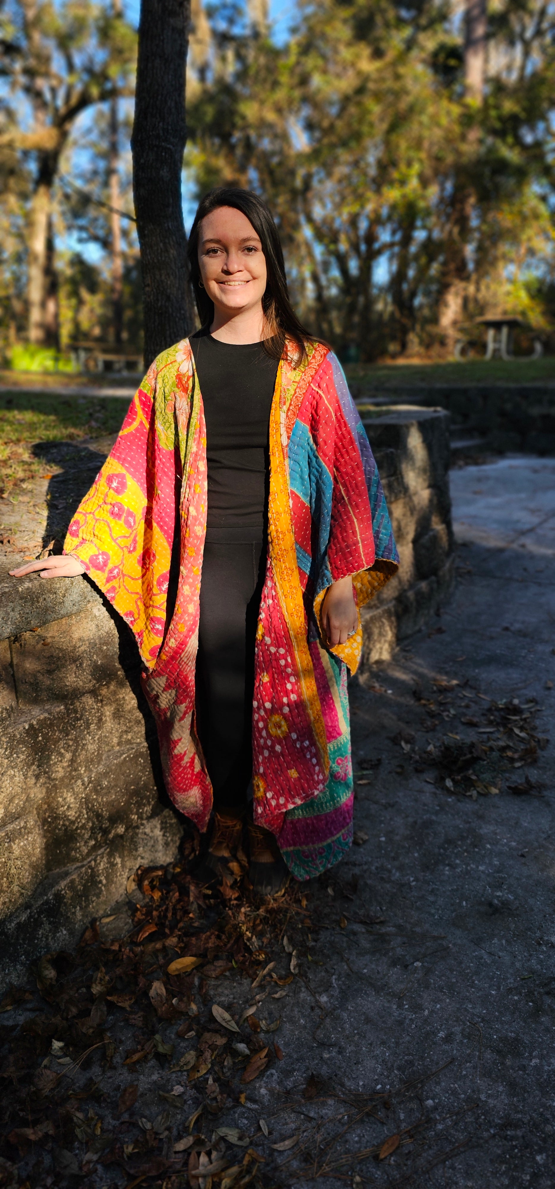 The Aryel Kantha kimono has tons of beautiful colors in it. So roomy and comfy. Features 2 pockets for comfort and storage!