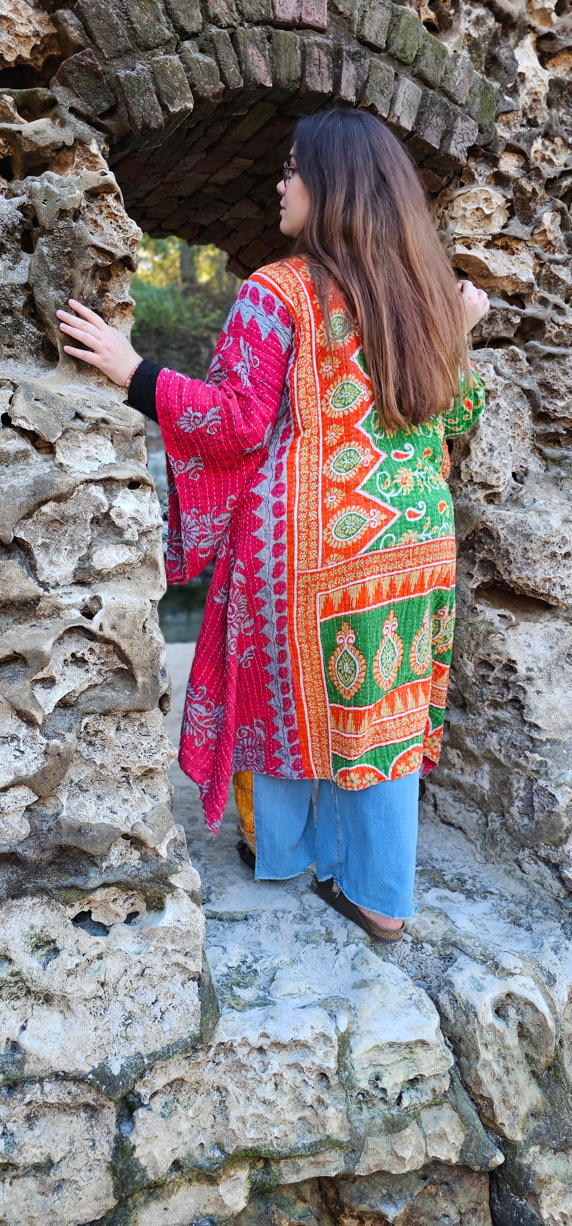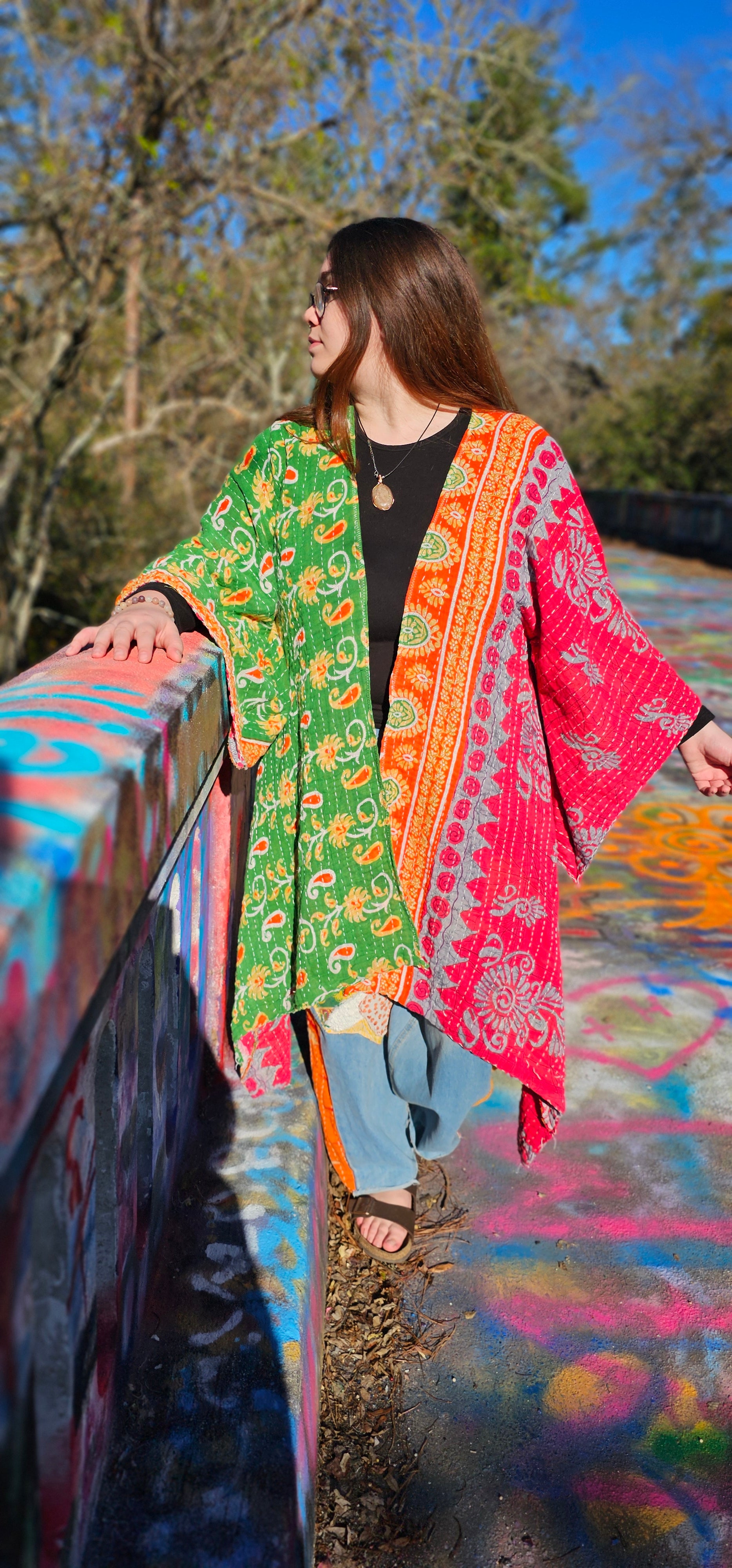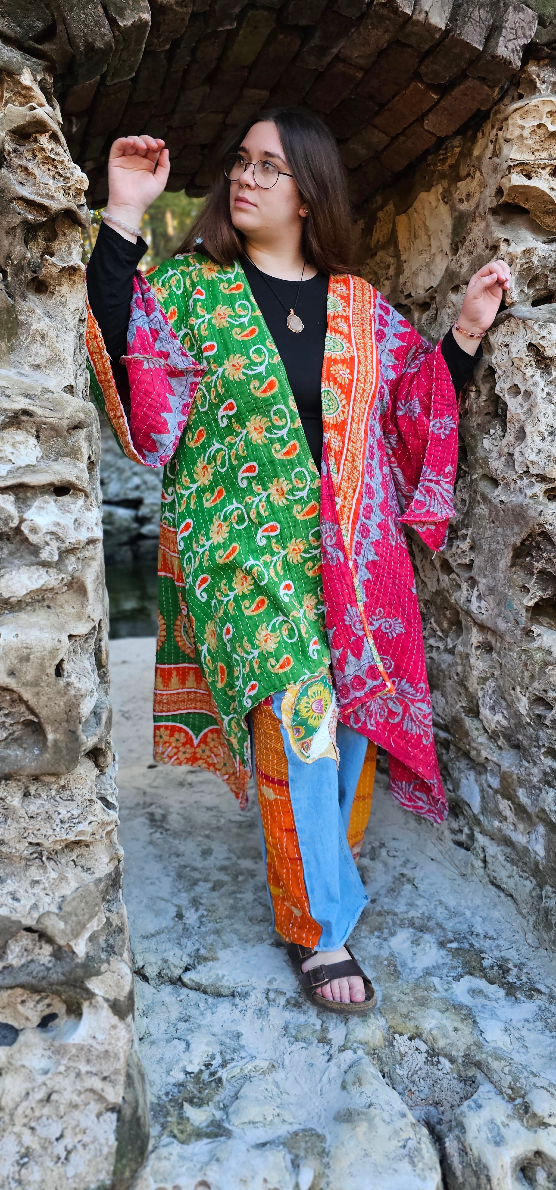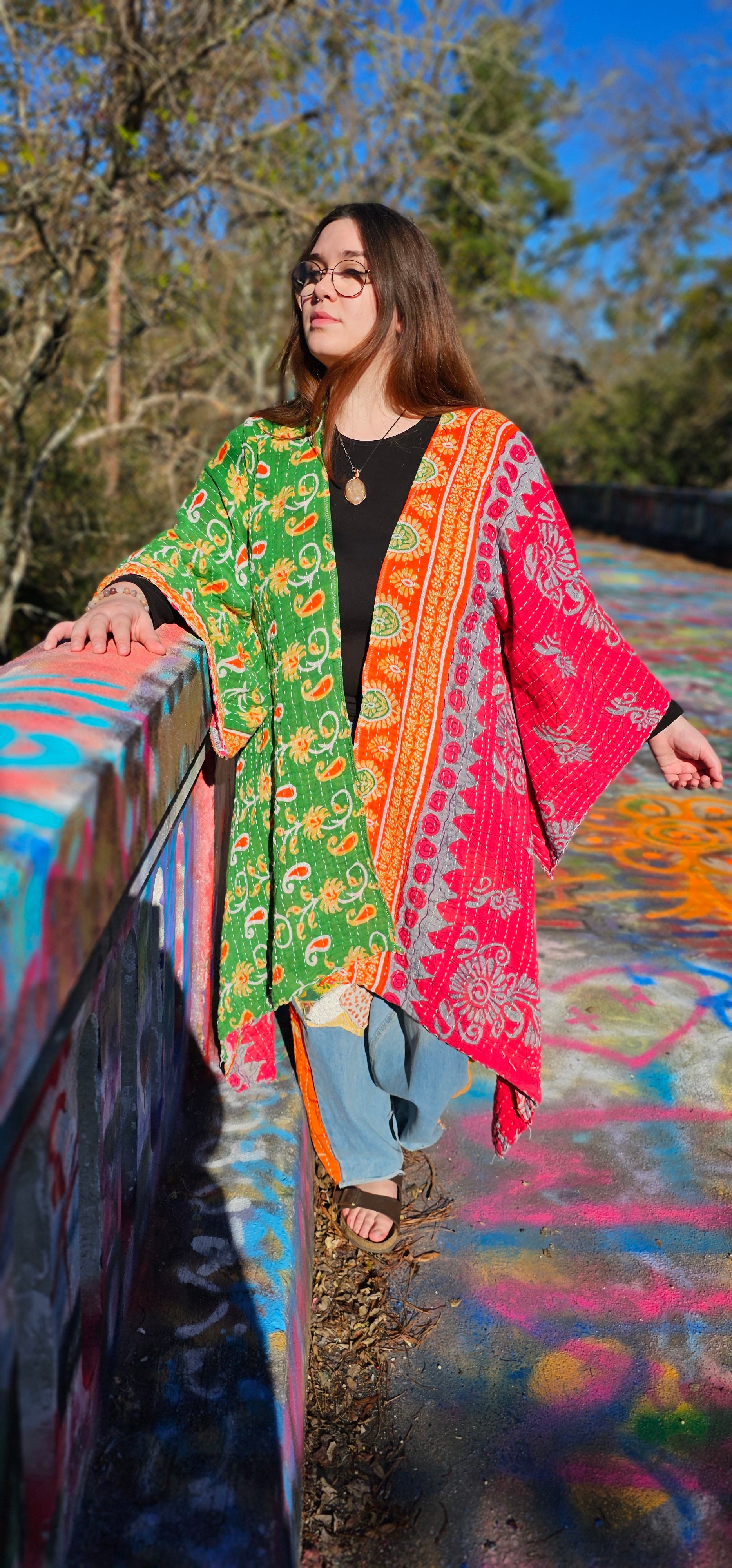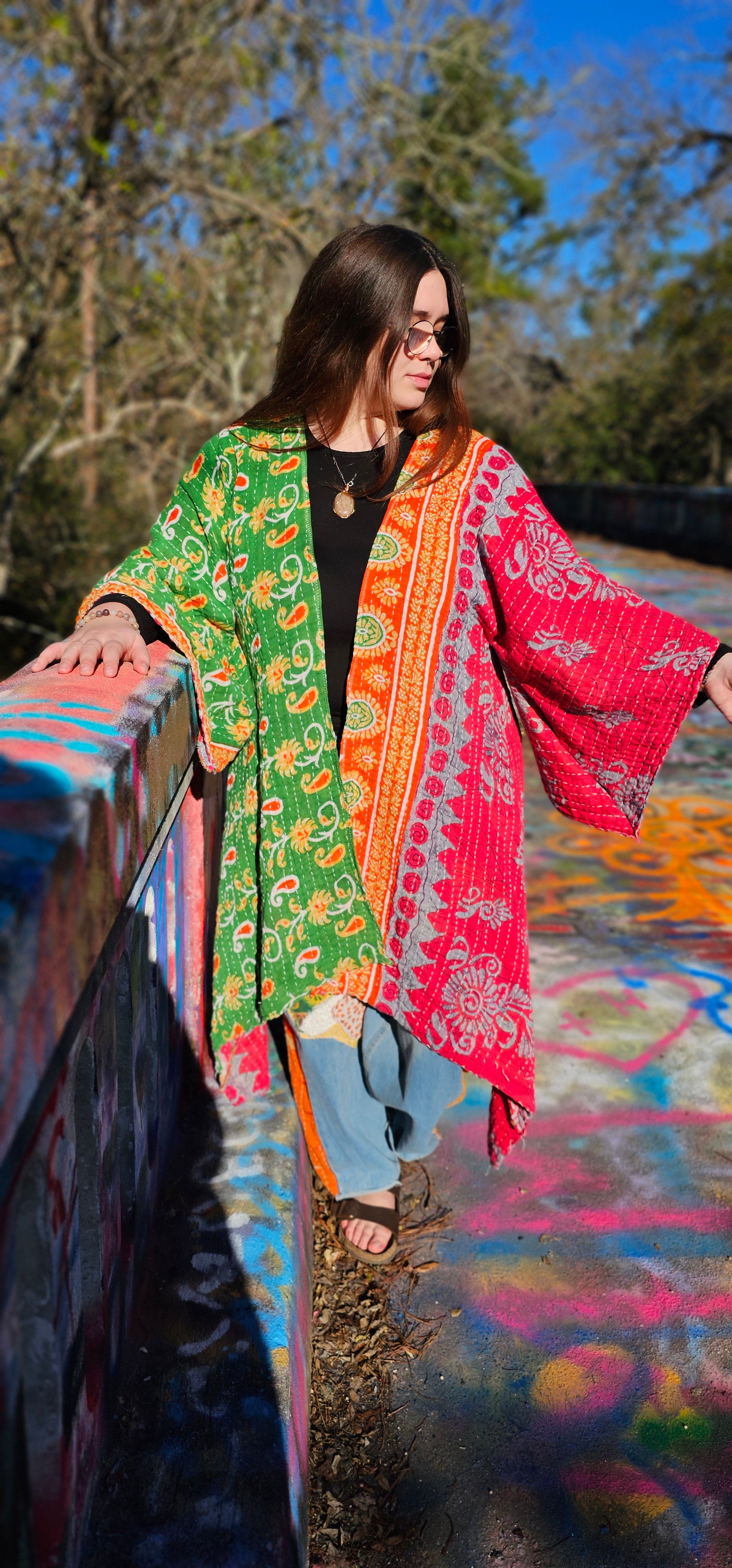 Our Kantha Kimonos are handmade right here at Little Hippie Chick in downtown Tifton, GA. With all of your good vibrations and groovy flow this kimono would be perfect for anything! From chilly festival nights to cozy nights at home, this Kimono is calling your name!