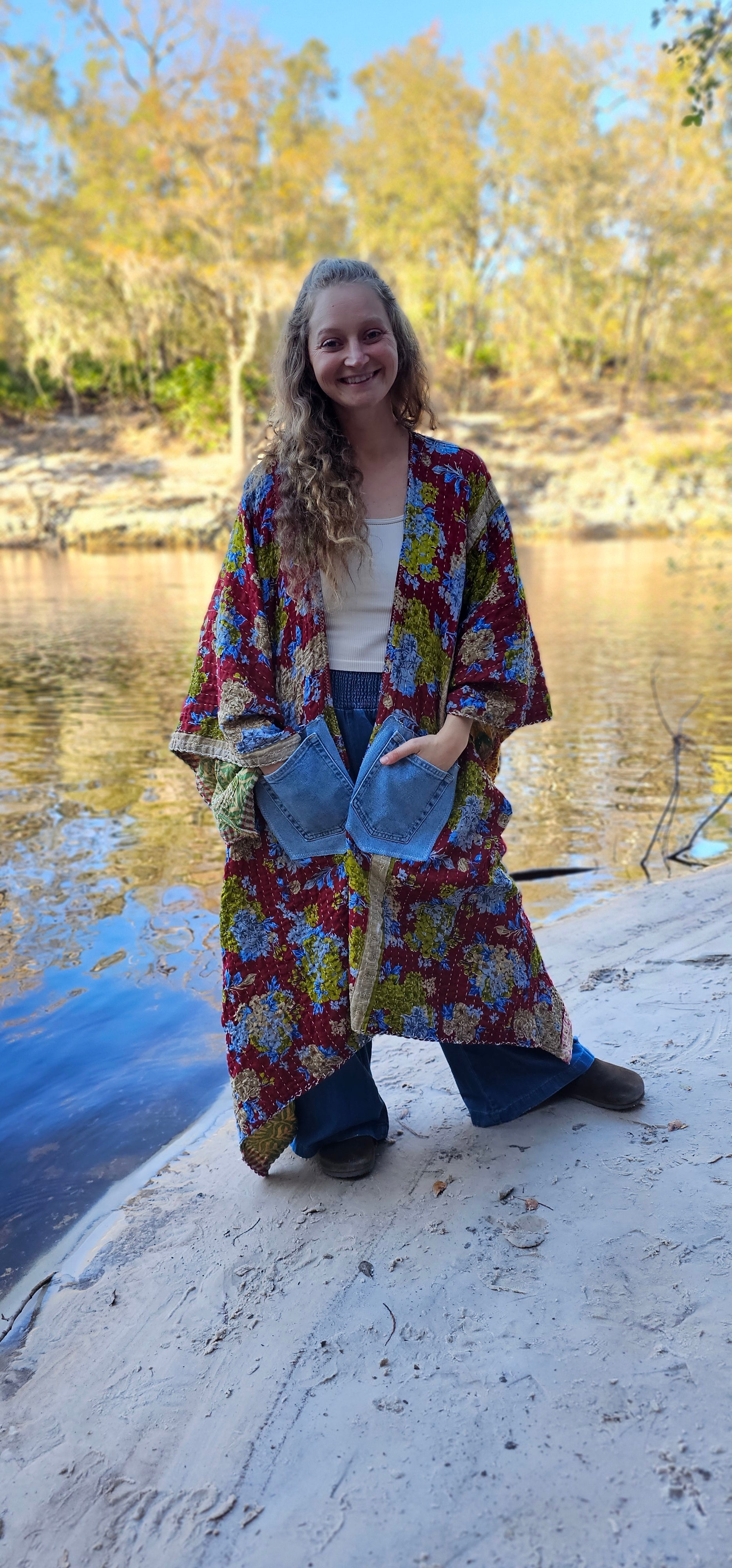 Our Kantha Kimonos are handmade right here at Little Hippie Chick in downtown Tifton, GA. With all of your good vibrations and groovy flow this kimono would be perfect for anything! From chilly festival nights to cozy nights at home, this Kimono is calling your name!
