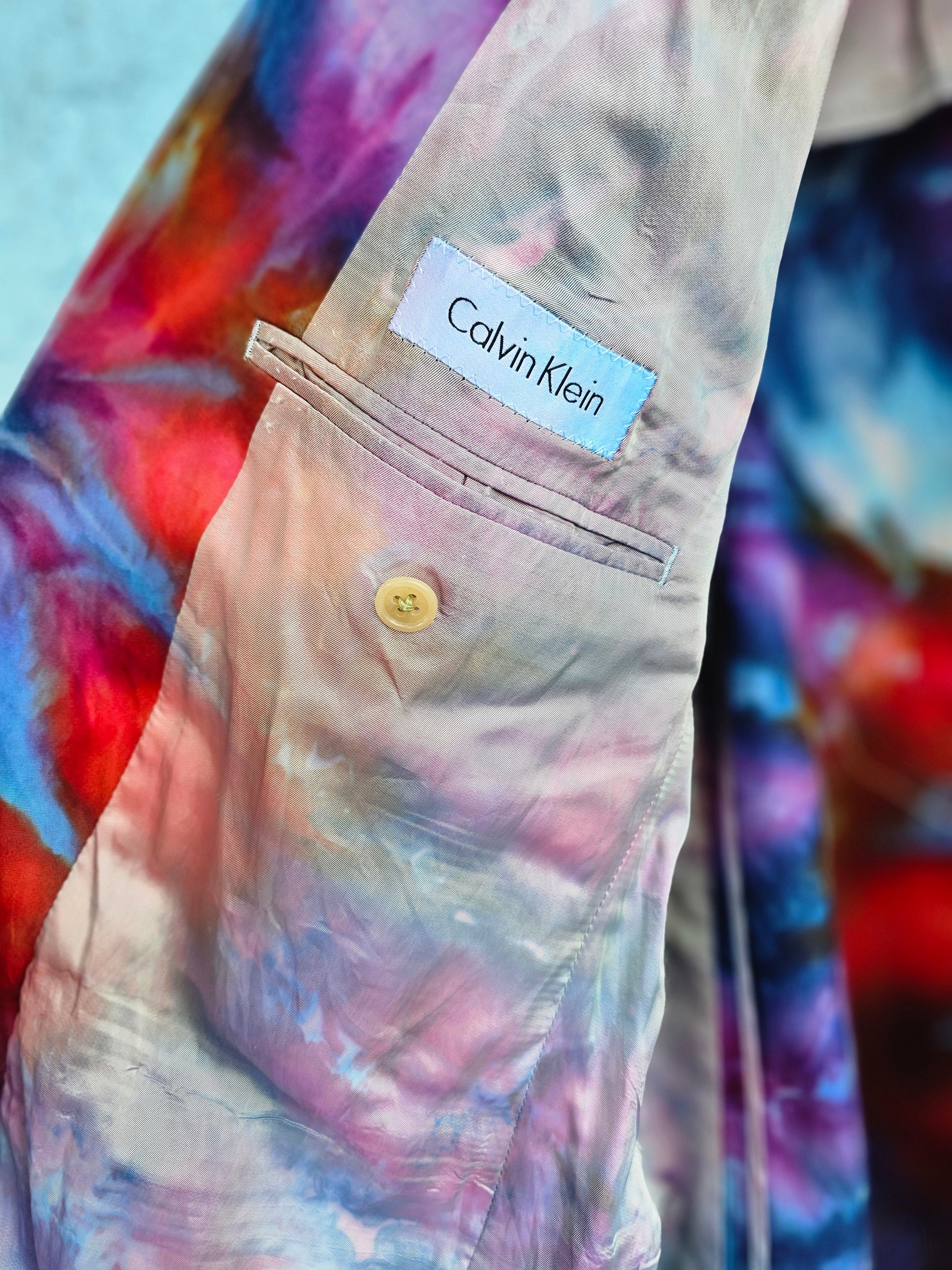 Discover a fusion of classic sophistication and bohemian flair with Little Hippie Chick's Upcycled Calvin Klein Tie-Dyed Sport Coat. This unique piece transforms a timeless design into a vibrant expression of creativity and sustainability.