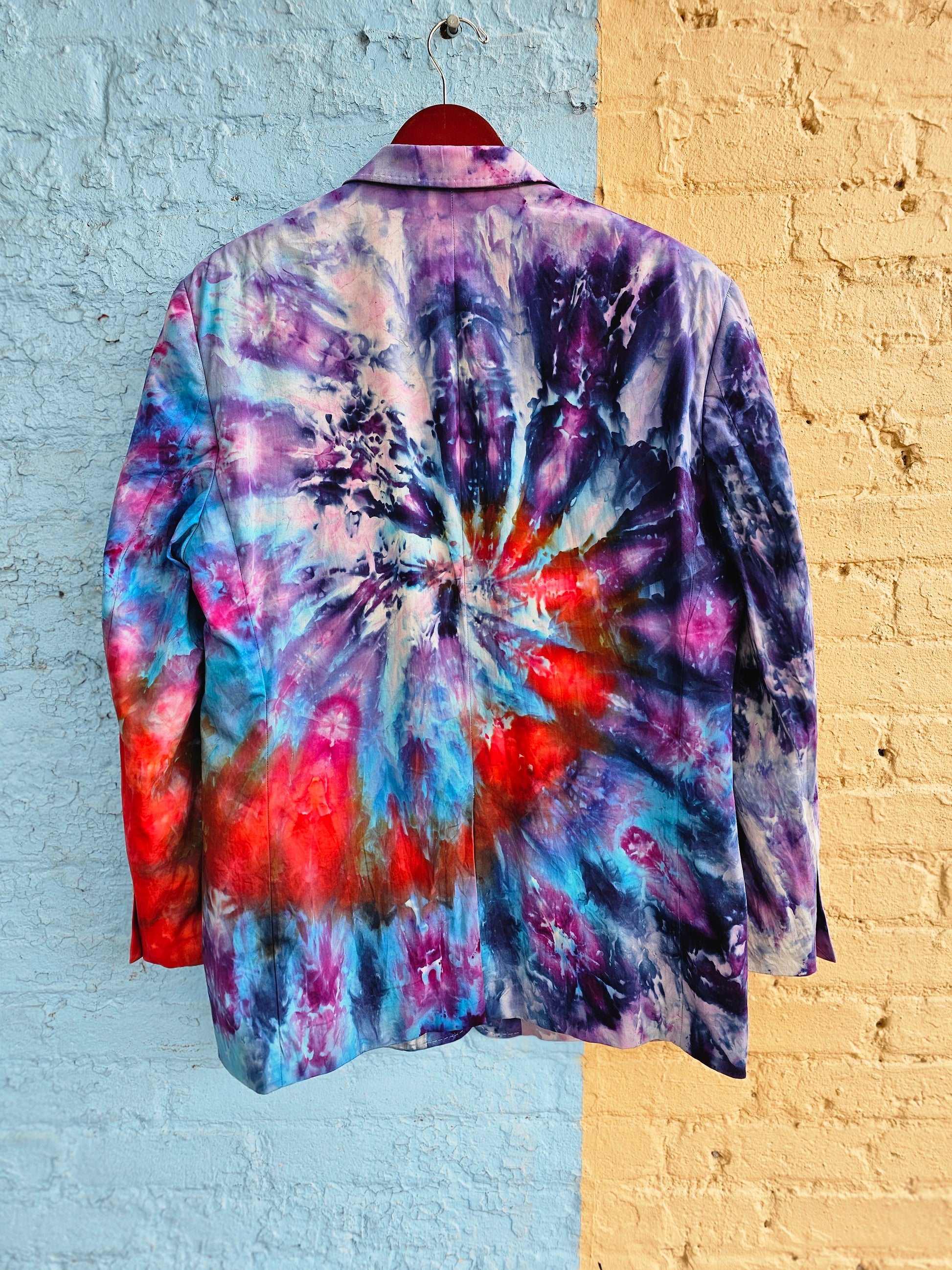 Meticulously tie-dyed by Papa Tom at Tie Dyed Shirt Shack, these piece creates a striking and one-of-a-kind garment that combines high fashion with hippie style. Perfect for making a statement at any event, this sport coat adds a pop of color and individuality to your wardrobe.