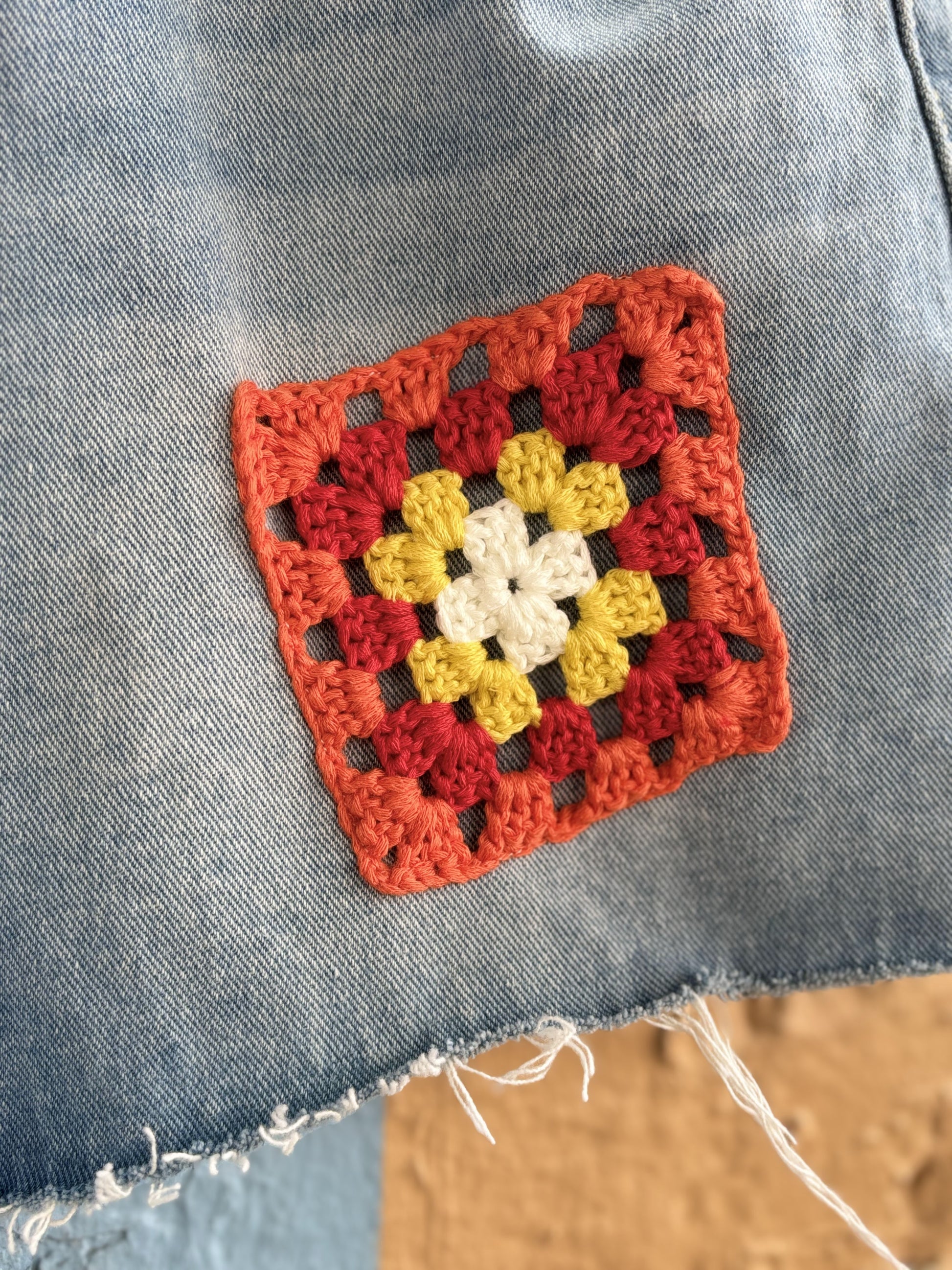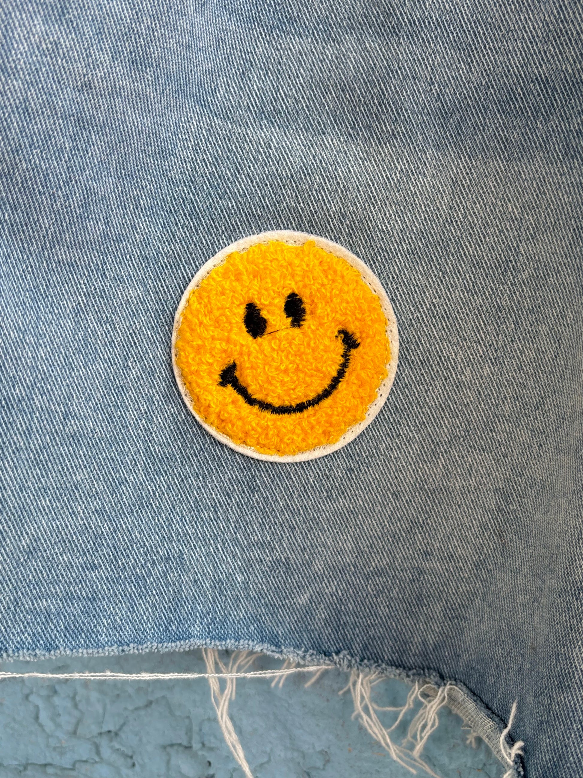 Fringed out at the bottom. Added granny square and smiley face patch on the front. Loads of smiles on the back!