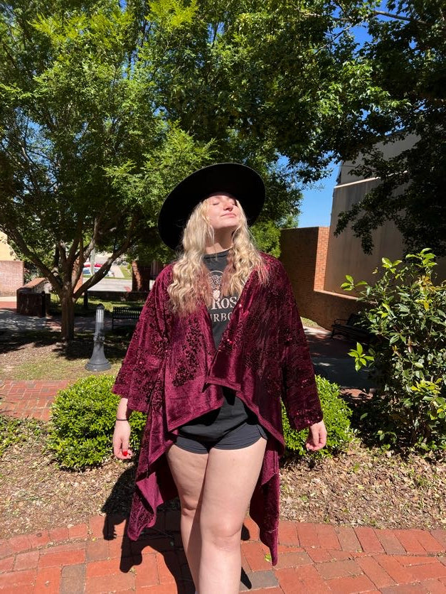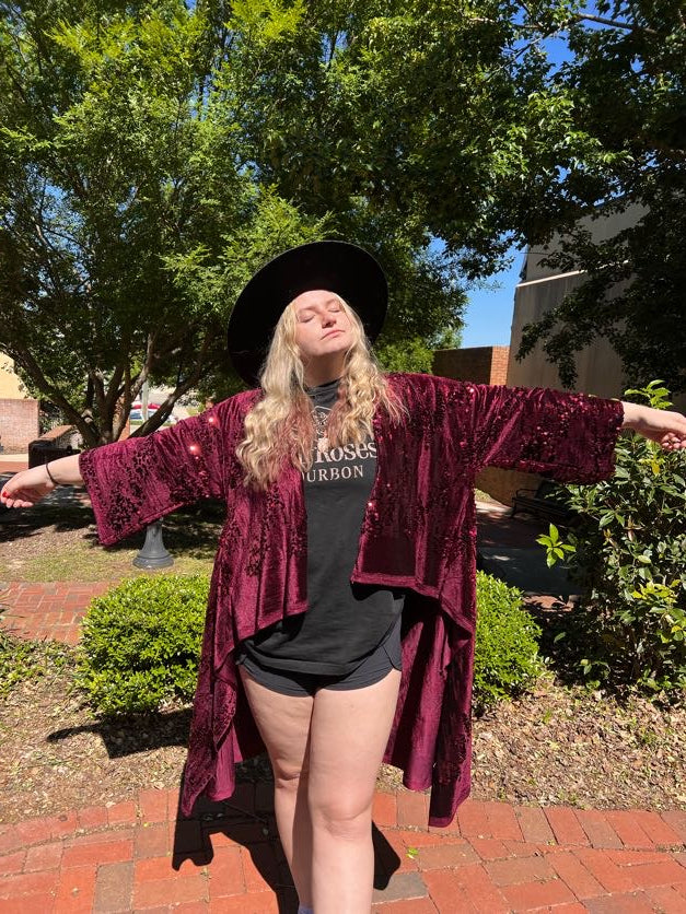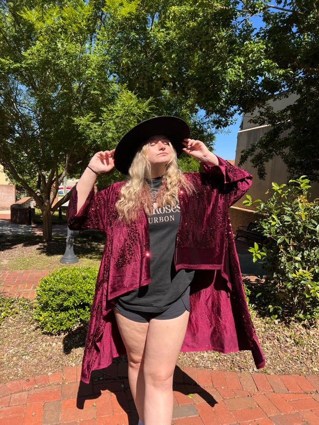 Evoke the enchanting spirit of Stevie Nicks with our Handmade Sequin Robe from Little Hippie Chick. This stunning robe is a tribute to the iconic style of the legendary singer, featuring intricate sequin detailing that shimmers and shines with every move you make. Whether you're dancing under the moonlight or lounging in luxury, this robe will make you feel like a true rock 'n' roll goddess.